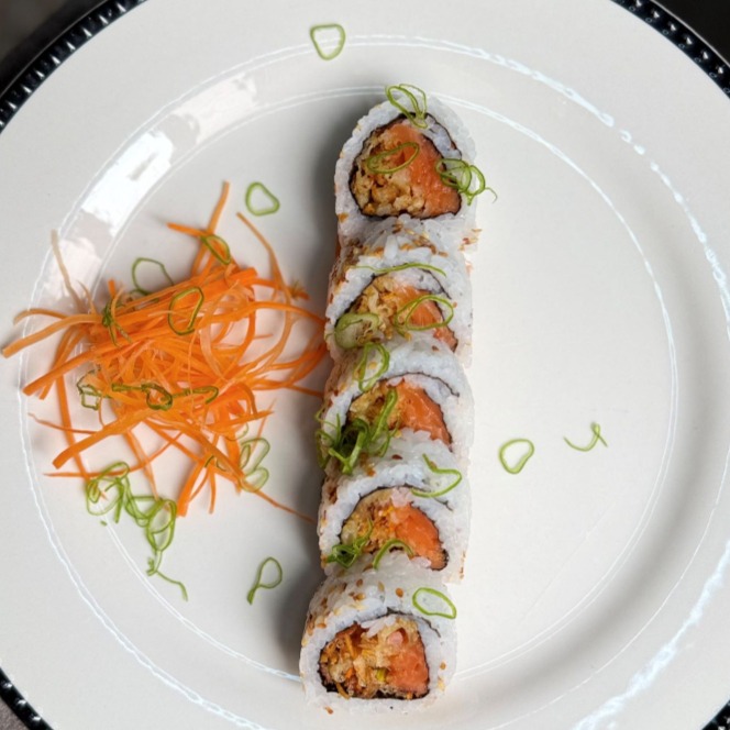 10 bocados de sushi de langostino tempurado, aguacate y queso crema,con topping de salmon fresco y mayo spicy , salsa de angula.