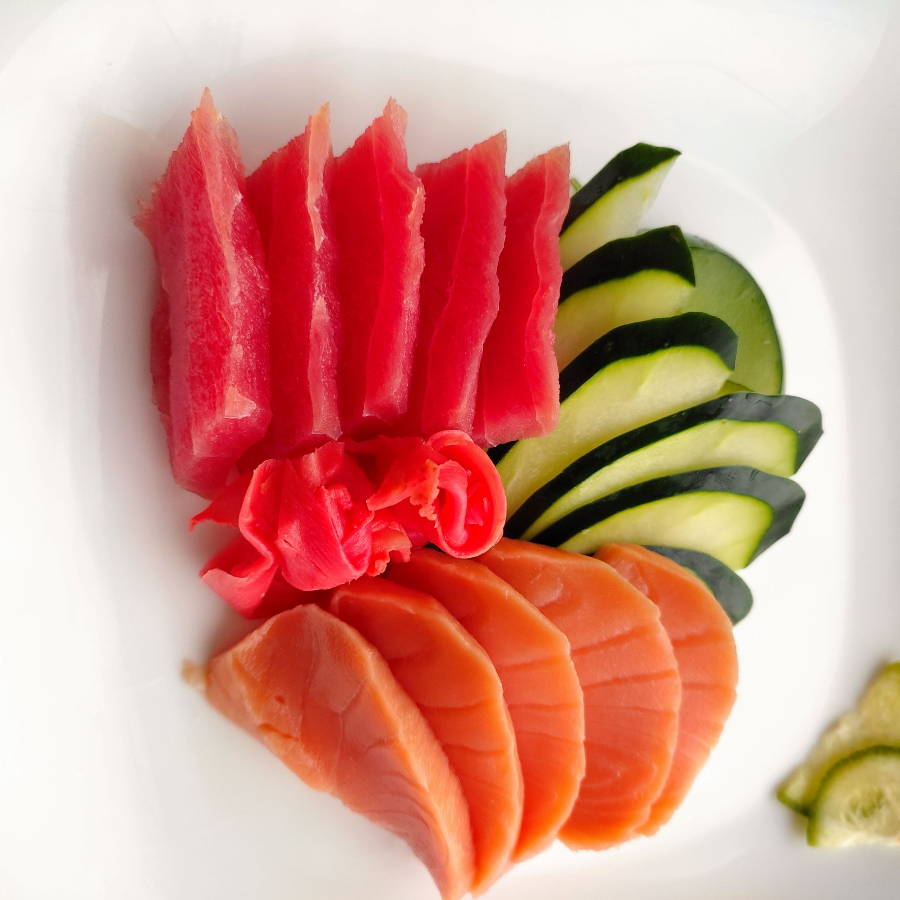 5 cortes de atun fresco. 5 cortes de salmon fresco. incluye soya y wasabi