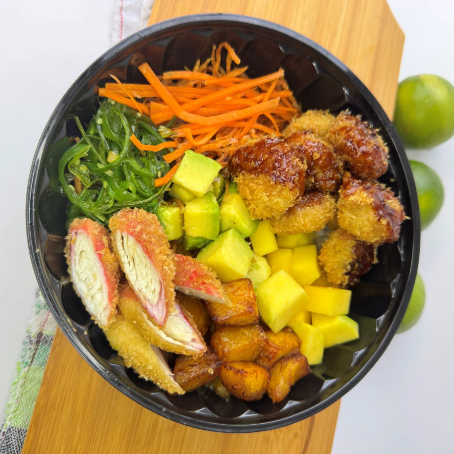 Bowl de base de arroz de sushi, camaron tempurado, palmito tempurado, mango, zanahoria,wakame, maduro frito, aguacate