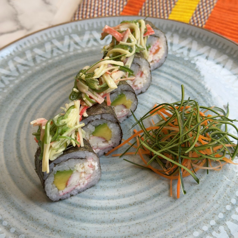 10 bocado de sushi de kanikama desmechado, aguacate, ensalada dinamita