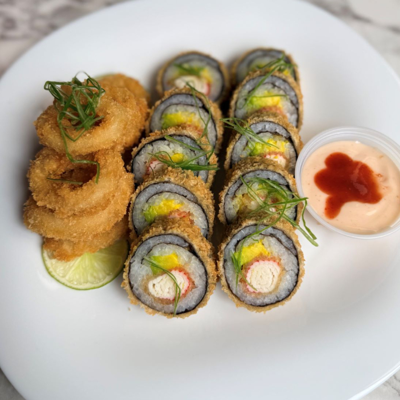 10 bocados de sushi de palmito tempurado, aguacate. acompañado de calamar temourados . salsa teriyaki y mayo spicy