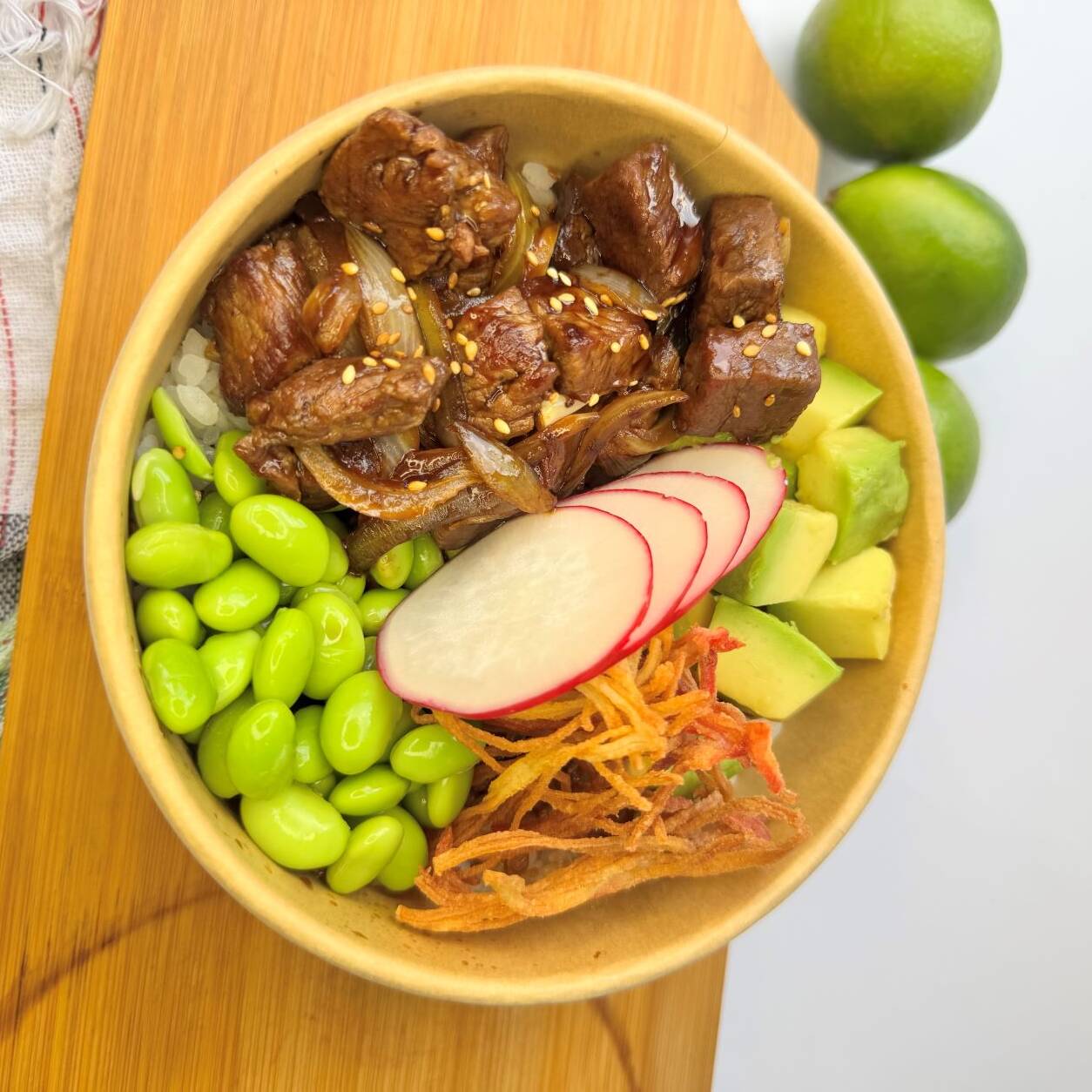 base de arroz de sushi, lomo de res teriyaki, edamames, zanahoria crispi, aguacate,,