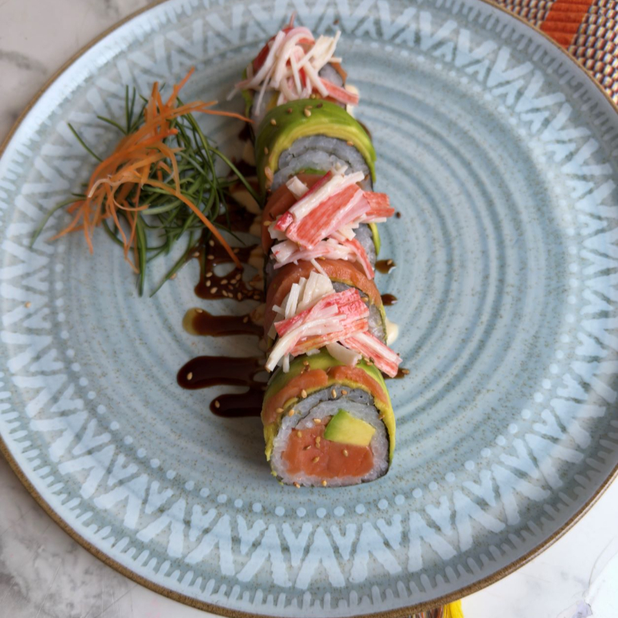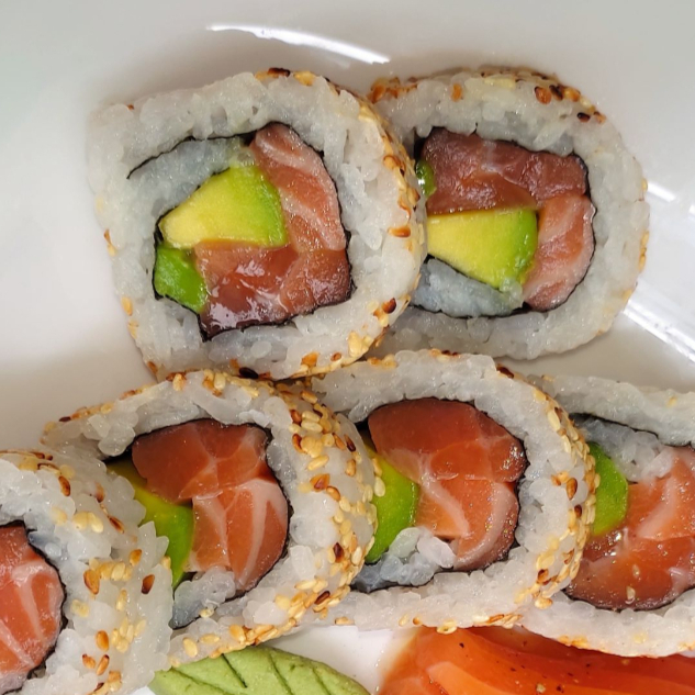 10 bocados de sushi de salmón fresco ,queso crema, aguacate, topping de ajonjolí y huevos de pescado.