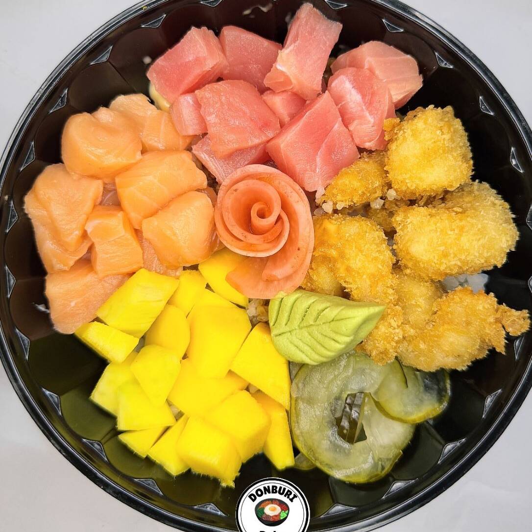 base de arroz de sushi, atun fresco, salmon fresco, camaron tempurado, pepino encurtido, rabano encurtido, mango , zanahoria,