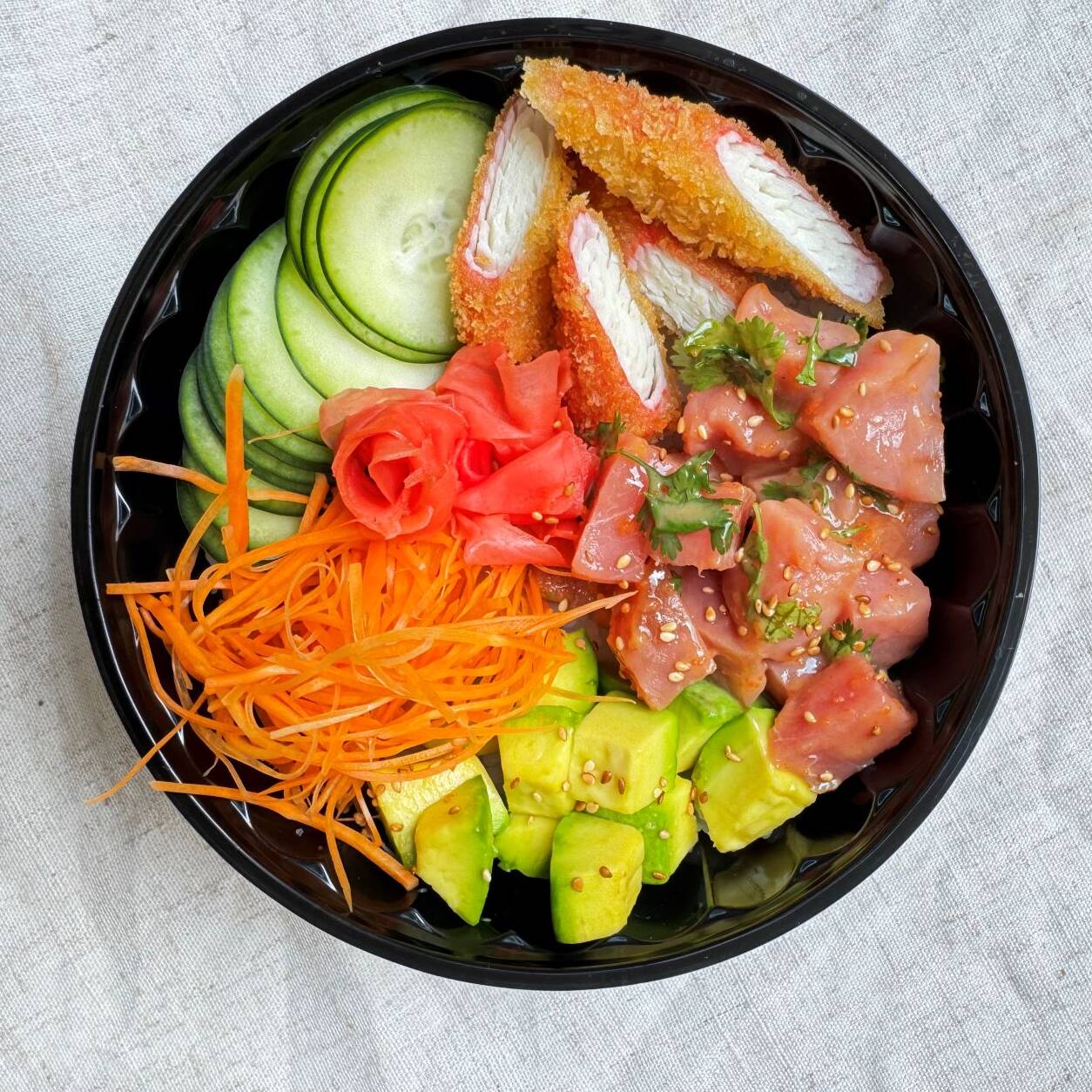 bowl de base de arroz de sushi, atun fresco aderezado con salsa picante, palmito tempura, aguacate, zanahoria, pepino, rabano encurtido