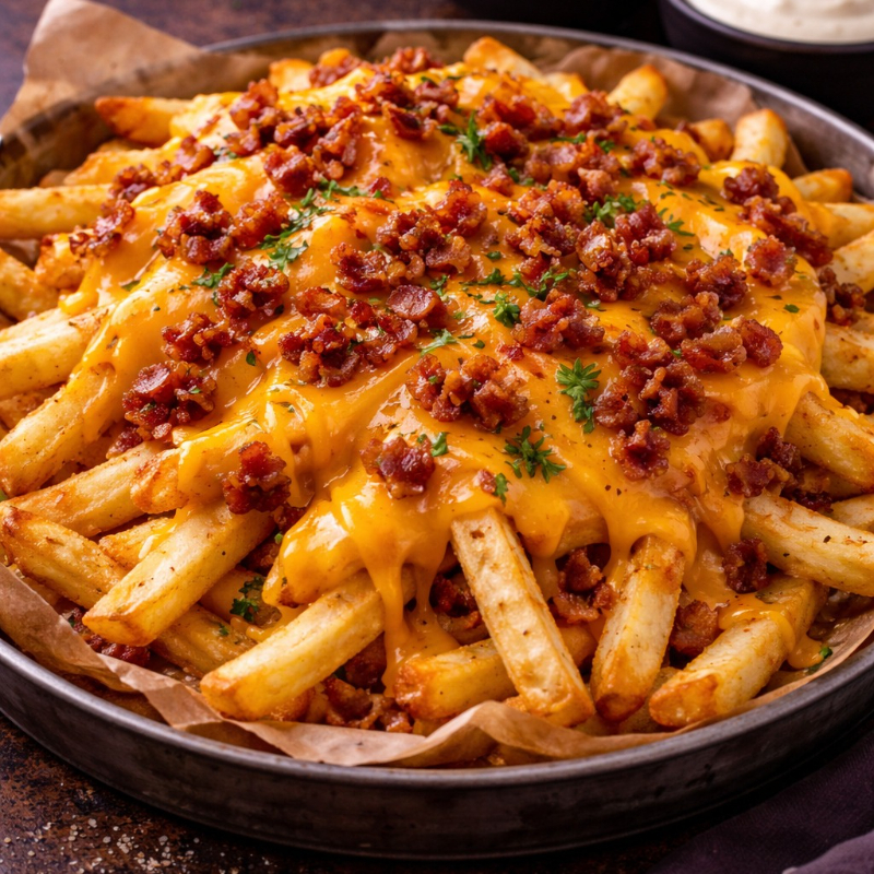 Papas fritas cubiertas con queso cheddar derretido y tocineta crujiente
