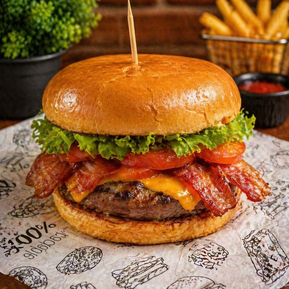 320 Gramos de carne de res angus, doble queso cheddar, doble tocineta, lechuga tomate , salsas.