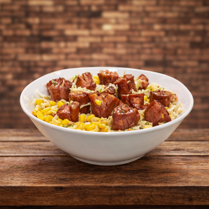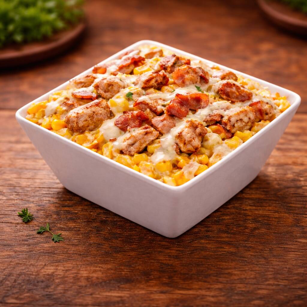 Maíz dulce, queso rallado mozzarella, pollo, tocineta, y salsa de la casa.