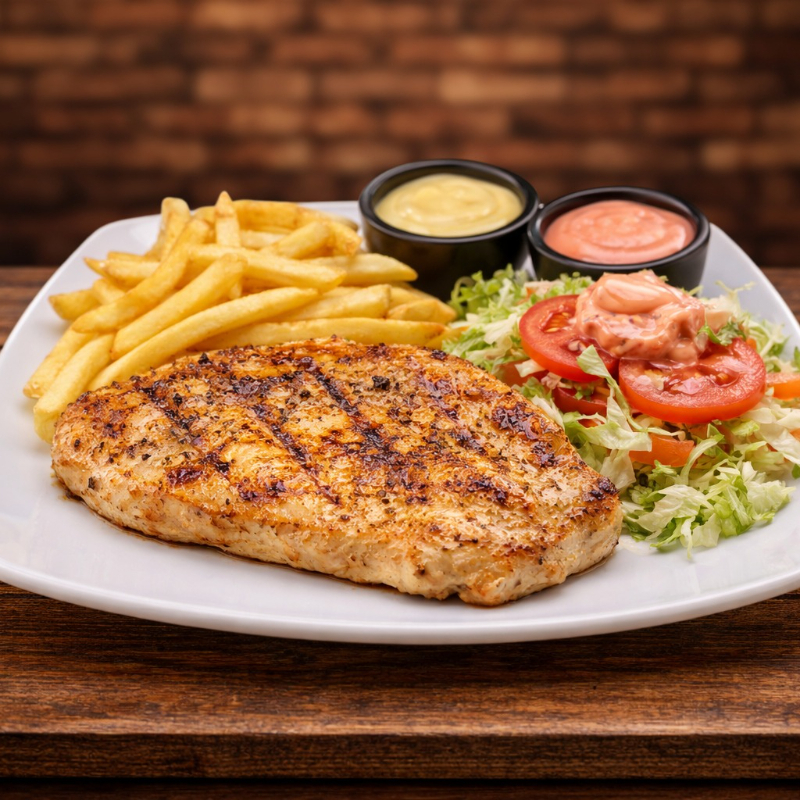 pechuga de pollo acompañada de papas a la francesa y ensalada