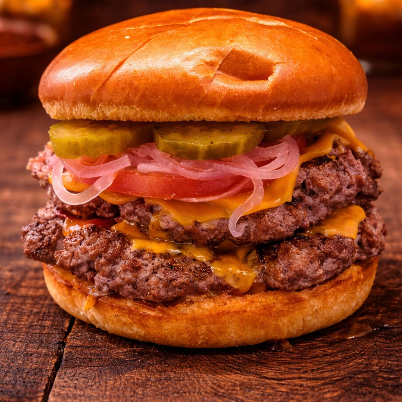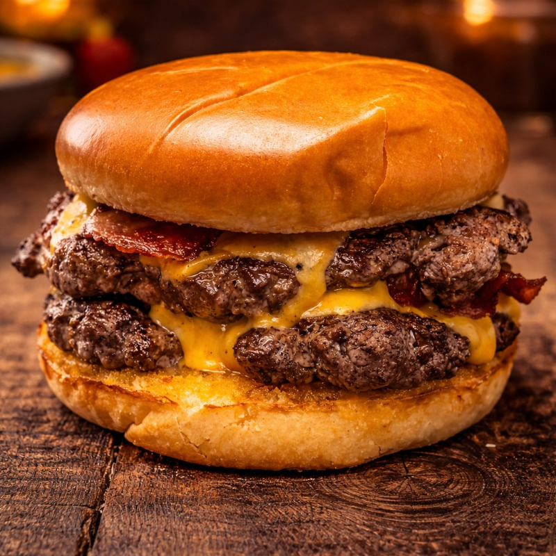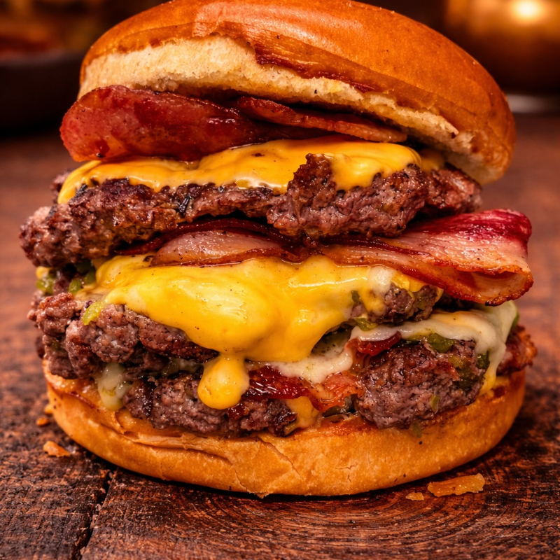 300 Gramos de carne de res angus, doble queso cheddar, doble tocineta