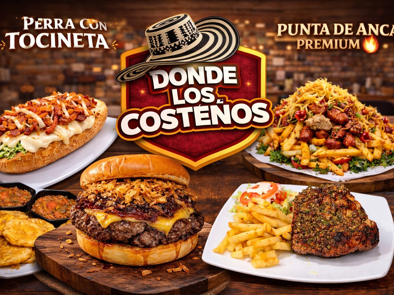 160 Gramos de carne de res angus, 150 gr pechuga de pollo, queso mozzarella, jamón, queso cheddar, tocineta, lechuga crespa tomate y salsa a elección, tomate, piña, mostaza y salsa de la casa