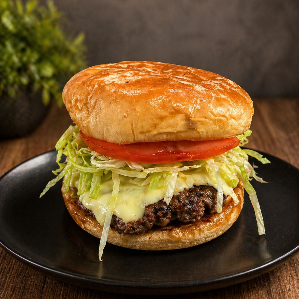 300 Gramos de carne de res angus, pepinillos, cebolla, queso cheddar, tomate, salsas.