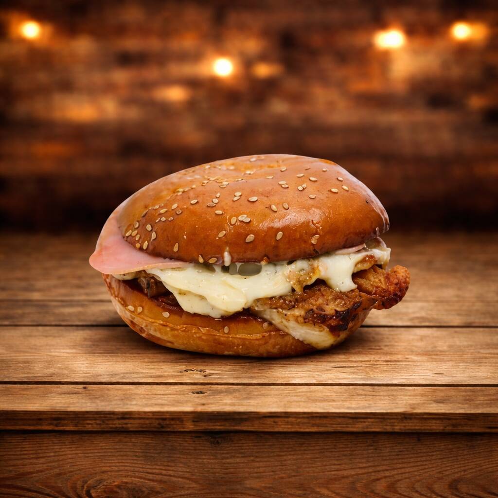 delicioso pan hamburguesa suave con una jugosa pechuga de pollo, acompañado de una lonja de jamon, queso derretido y fresca lechuga. para um toque crujiente agregamos ripio de papas fritas. logrando una combinacion de sabores y texturas inrresistibles.