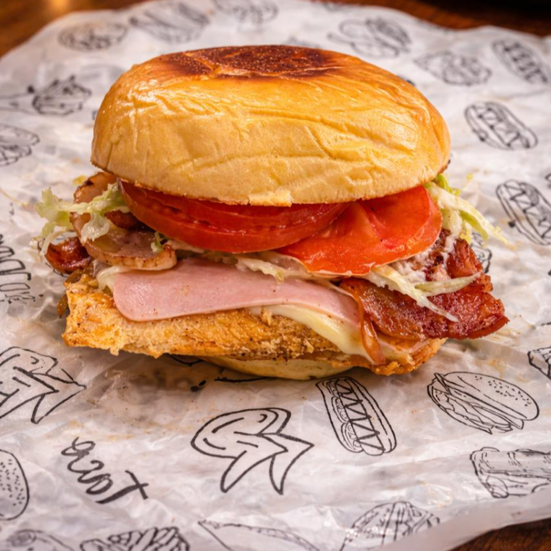 Pechuga de pollo artesanal, queso mozzarella, lechuga crespa, jamón y tocineta, tomate, salsa a elección