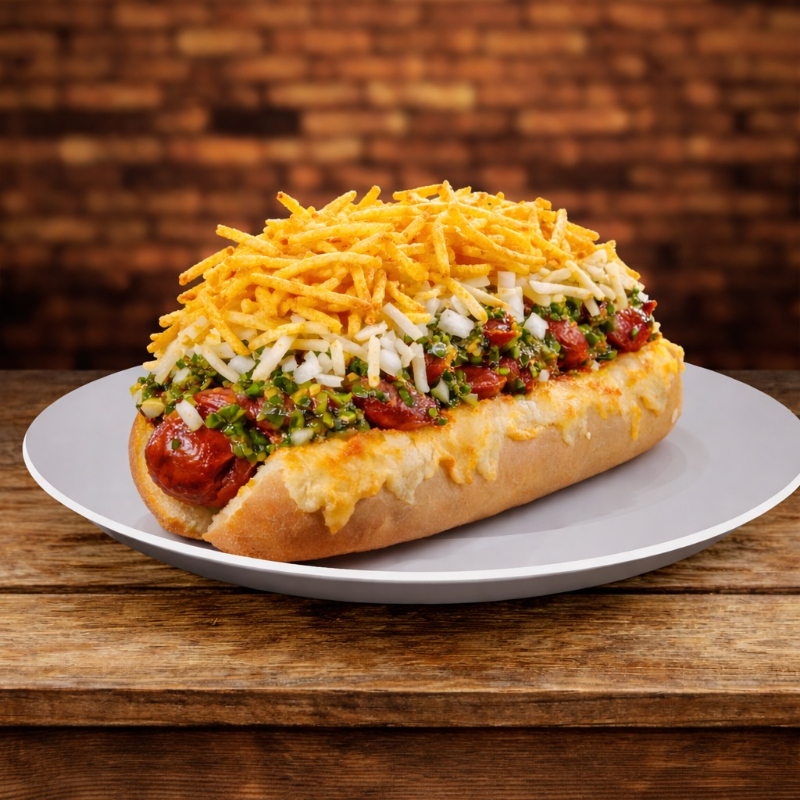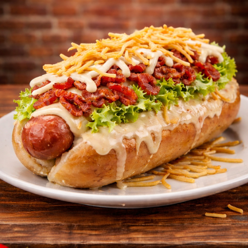 Salchicha américana, queso cheddar, tocineta, cebolla, lechuga, ripio de papa y salsa a elección.