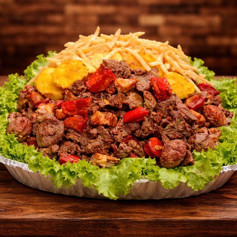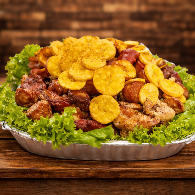 400 Gramos de carne de res, 400 g de pollo, 400 g de costilla ahumada bbq, chorizo, 200 gramos de chicharron, papa a la francesa, monedas de plátano, yuca frita.