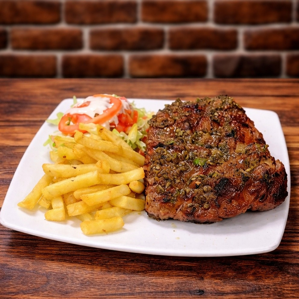 250 gramos de punta de angus acompañado de papas francesas y ensalada