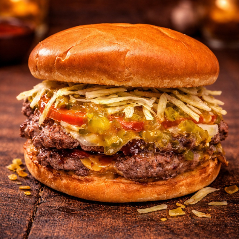 340 Gramos de carne de res angus, doble queso cheddar, relish de pepinillos, cebolla, tomate, lechuga crespa y salsas.