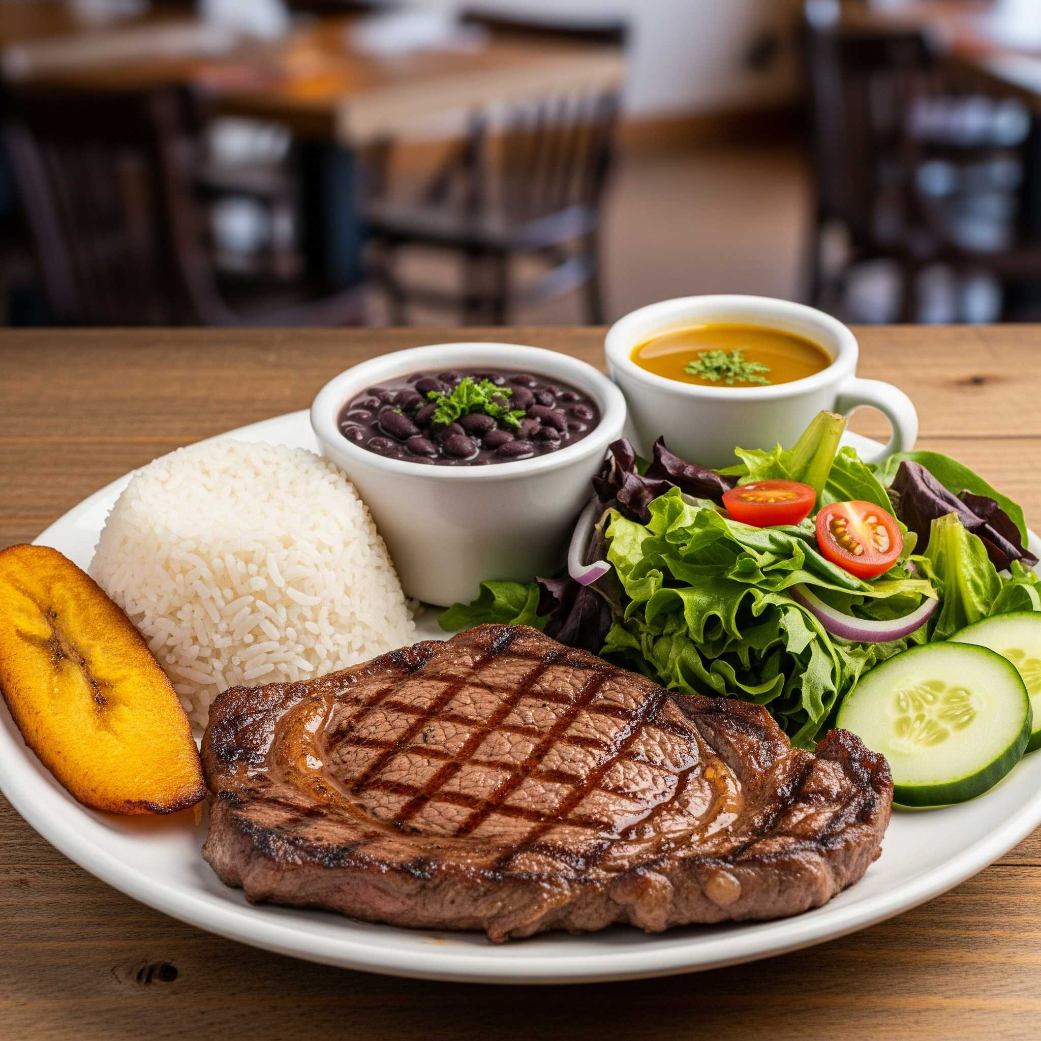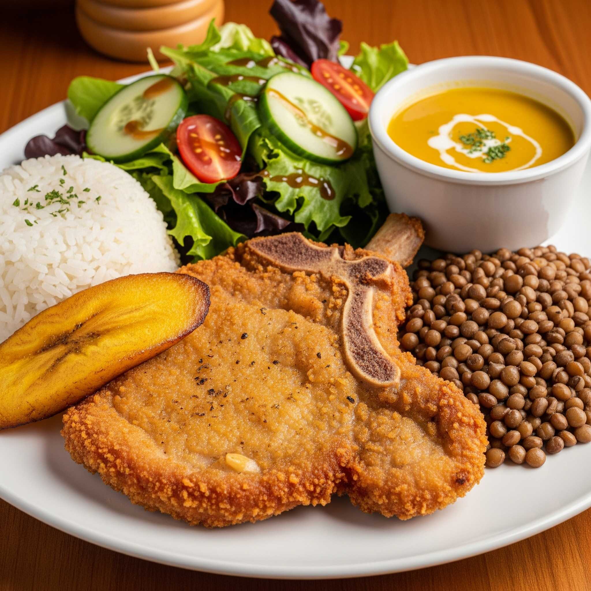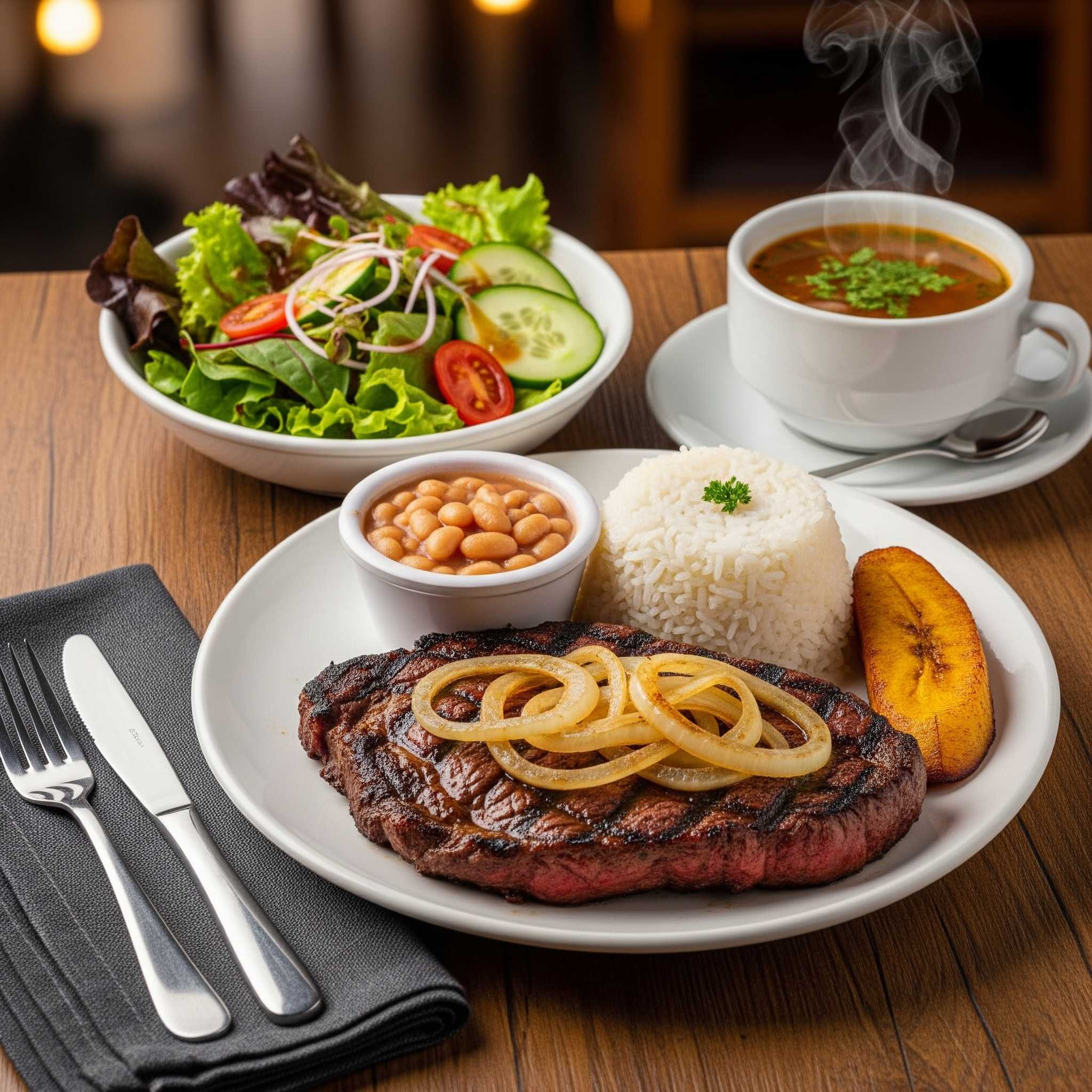 Acompañado de arroz, principio a elección, ensalada de la casa, sopa del día, tajada.