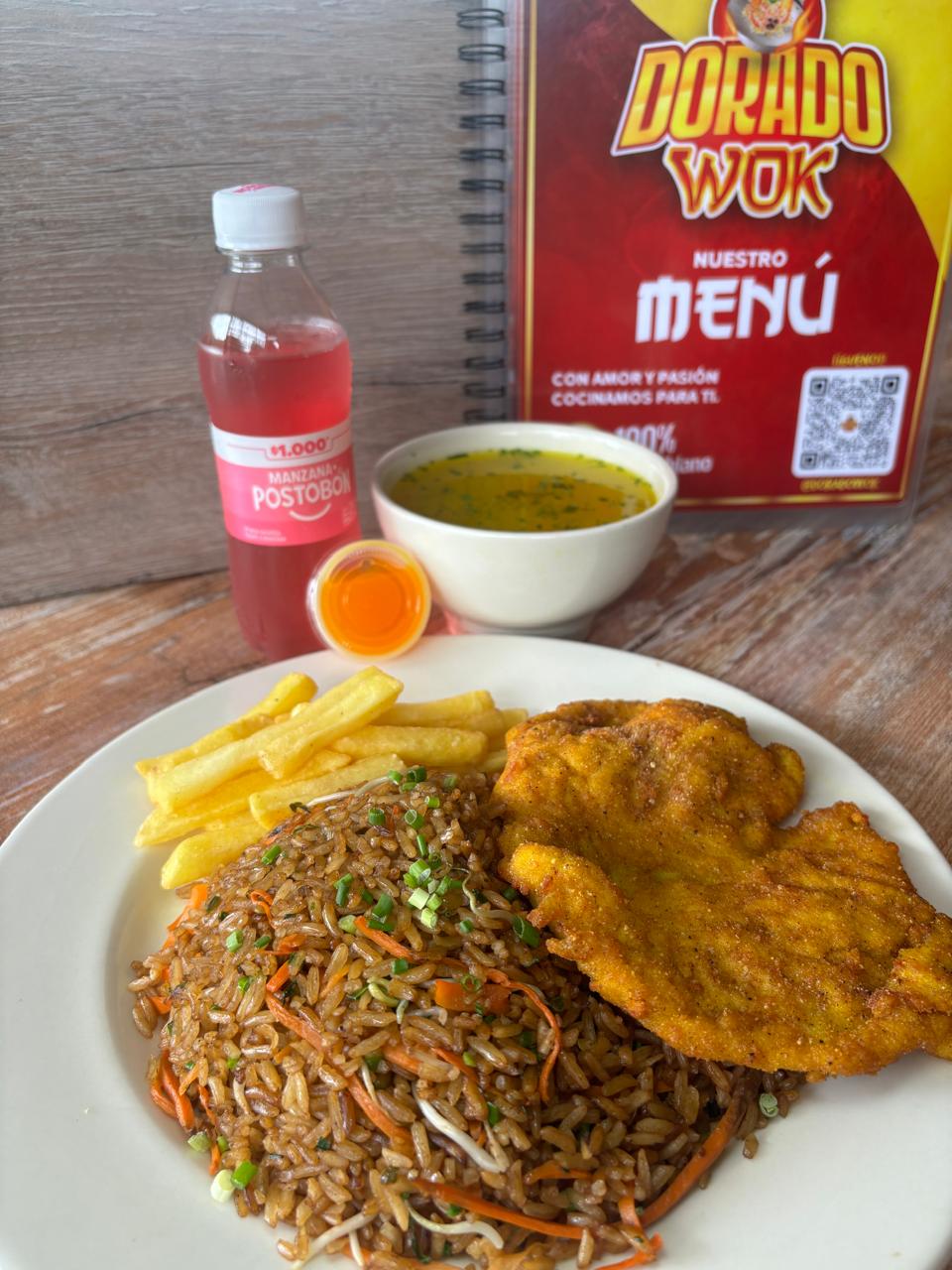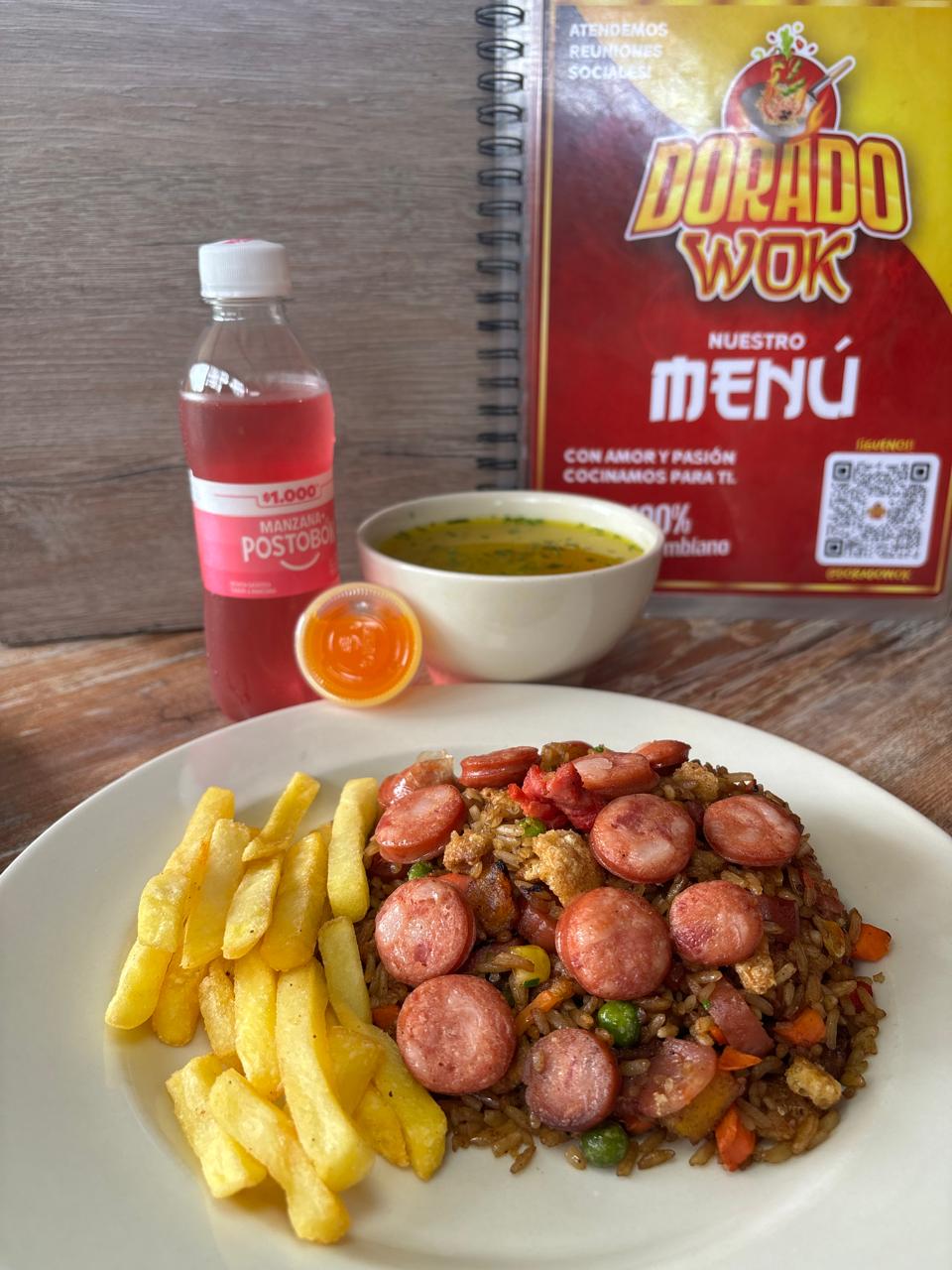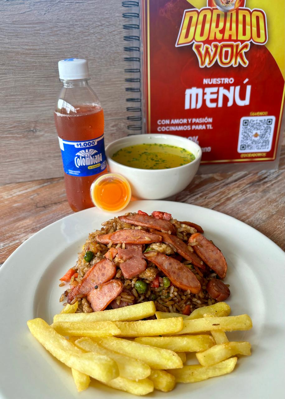 Arroz chino*1 + Porción de Consomé*1 + Porción de Papas francesas*1 + Bebida Almuerzo Ejecutivo*1