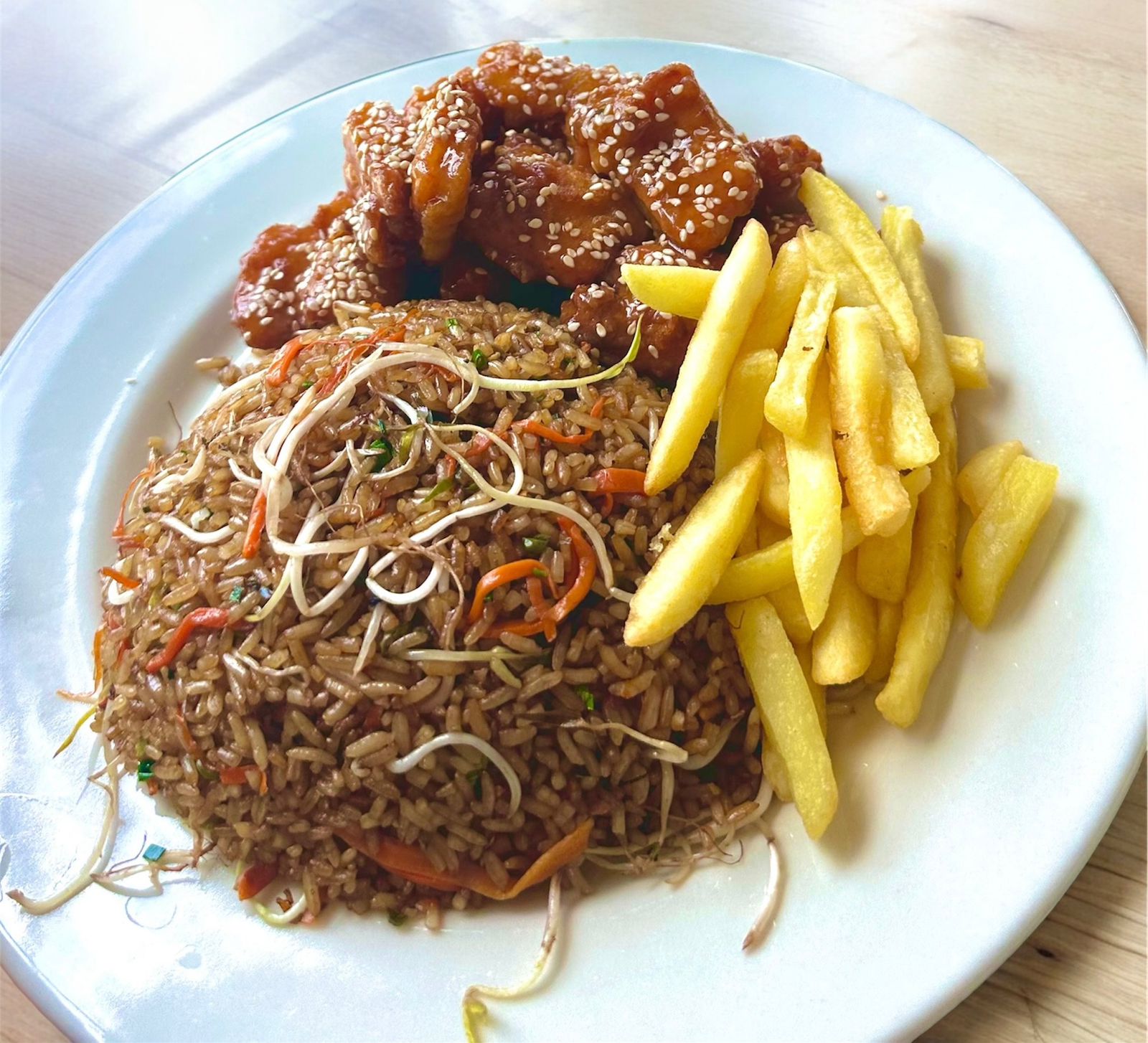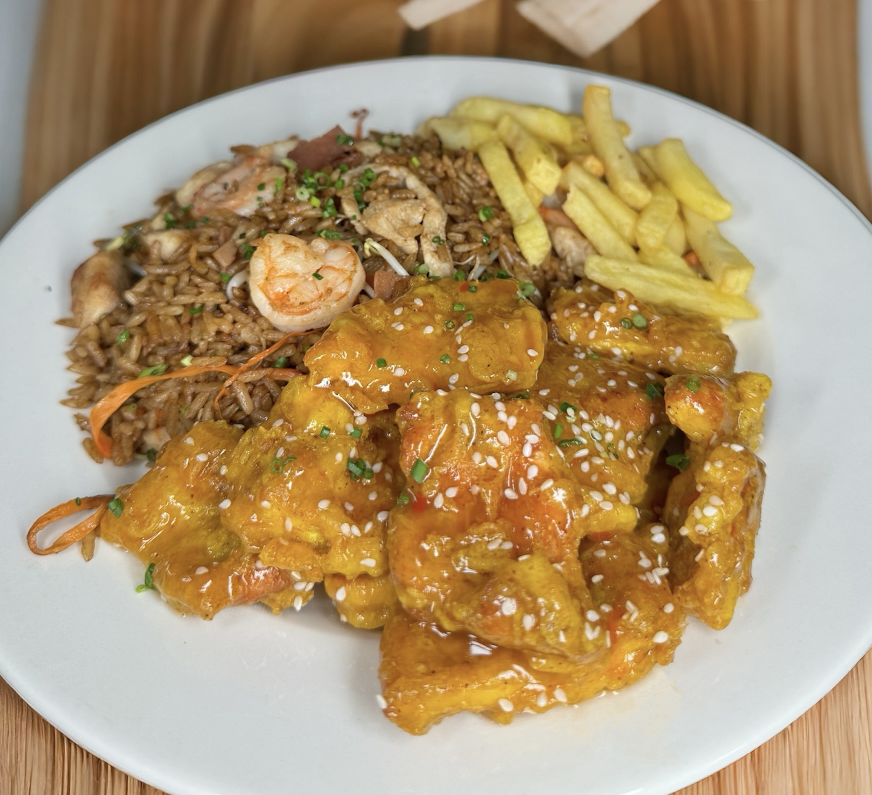 300 g De arroz (pollo, jamón, camarón, verduras salteadas al wok) + Trozos de pollo agridulce
