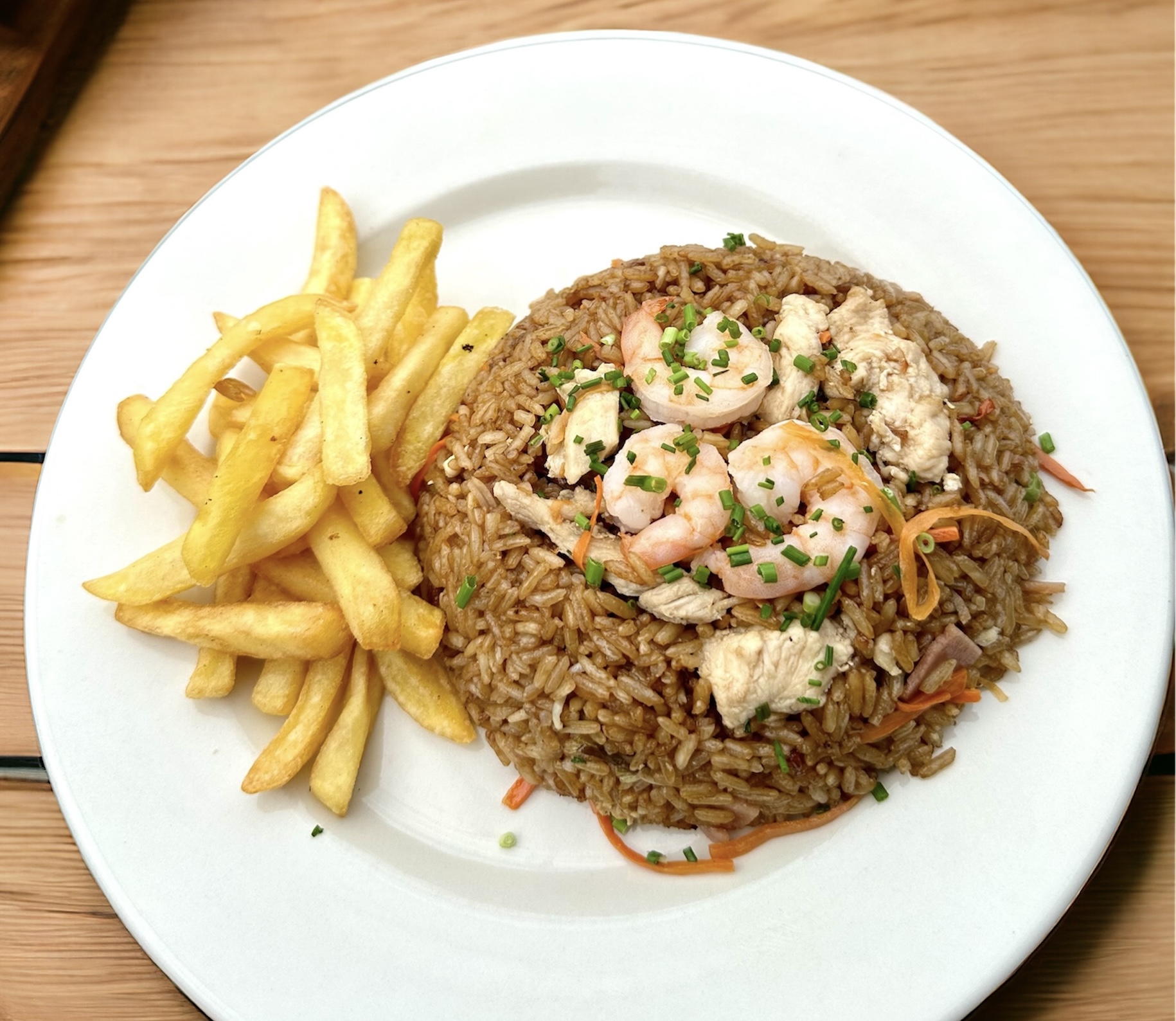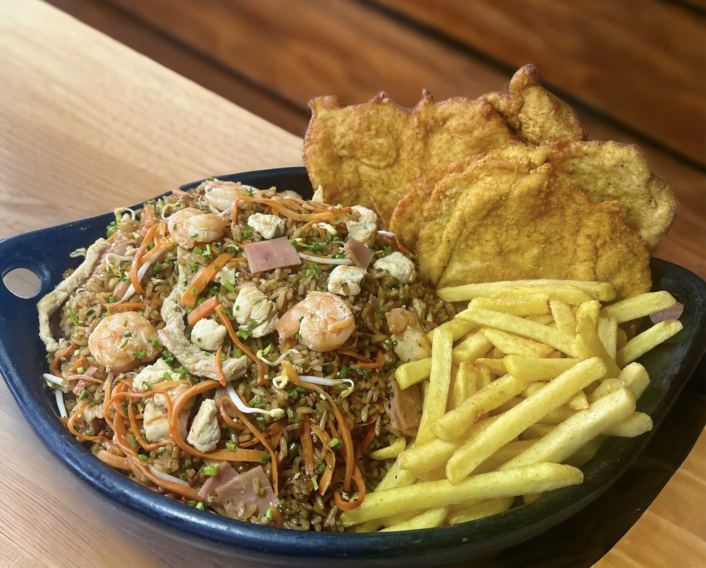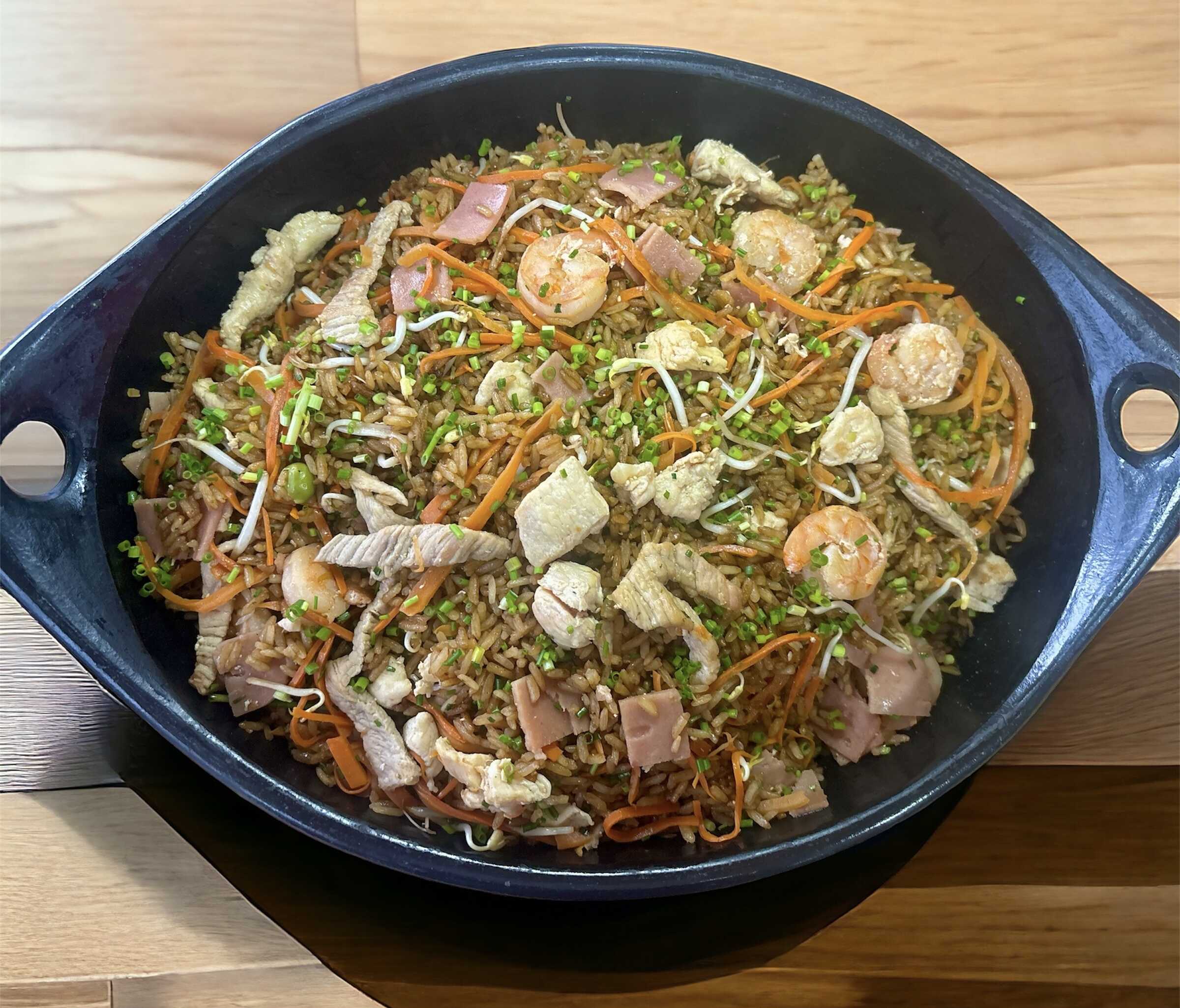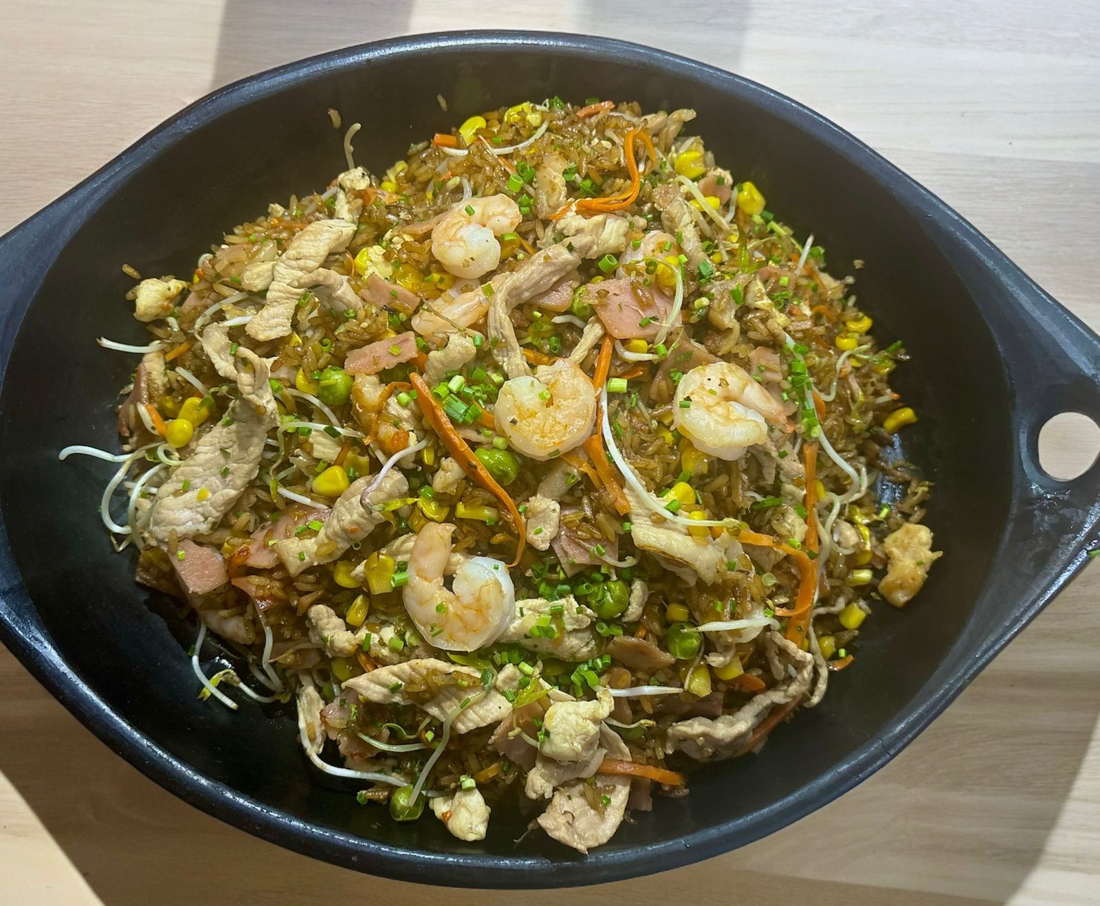 1200 g De arroz (pollo, jamón, camarón, verduras salteadas al wok) mas acompañante a elección.