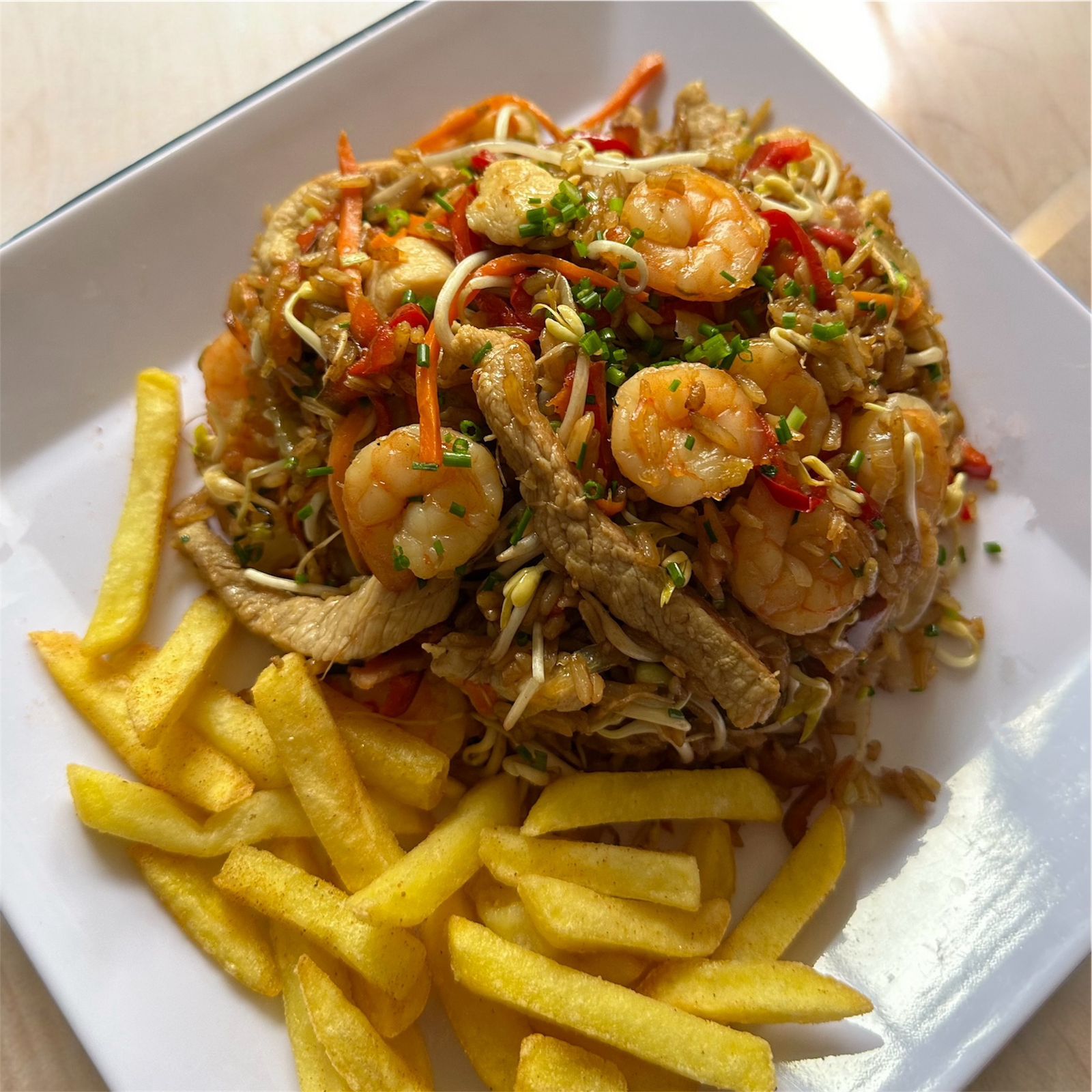 Camarón, cerdo, pollo, jamón, verduras salteadas al wok.