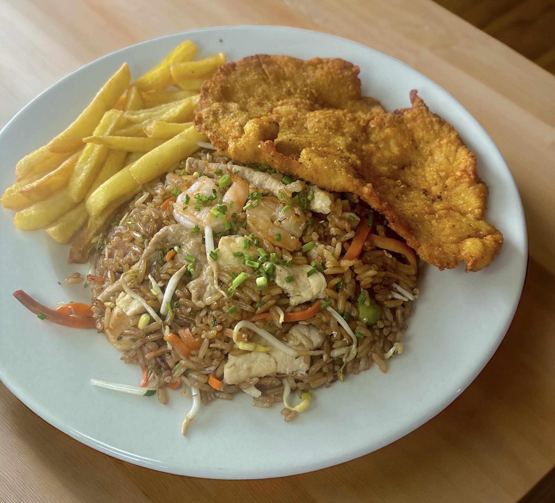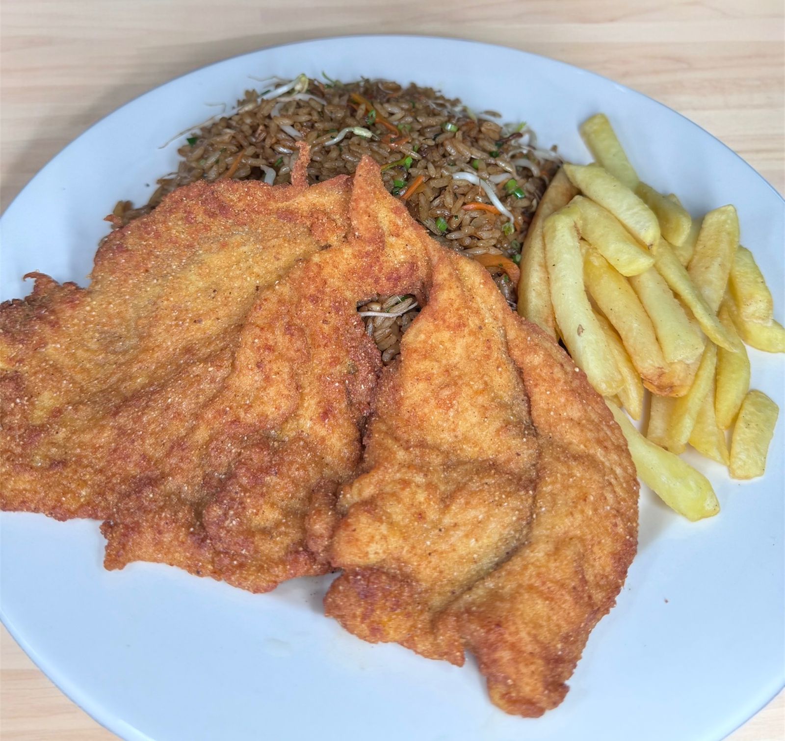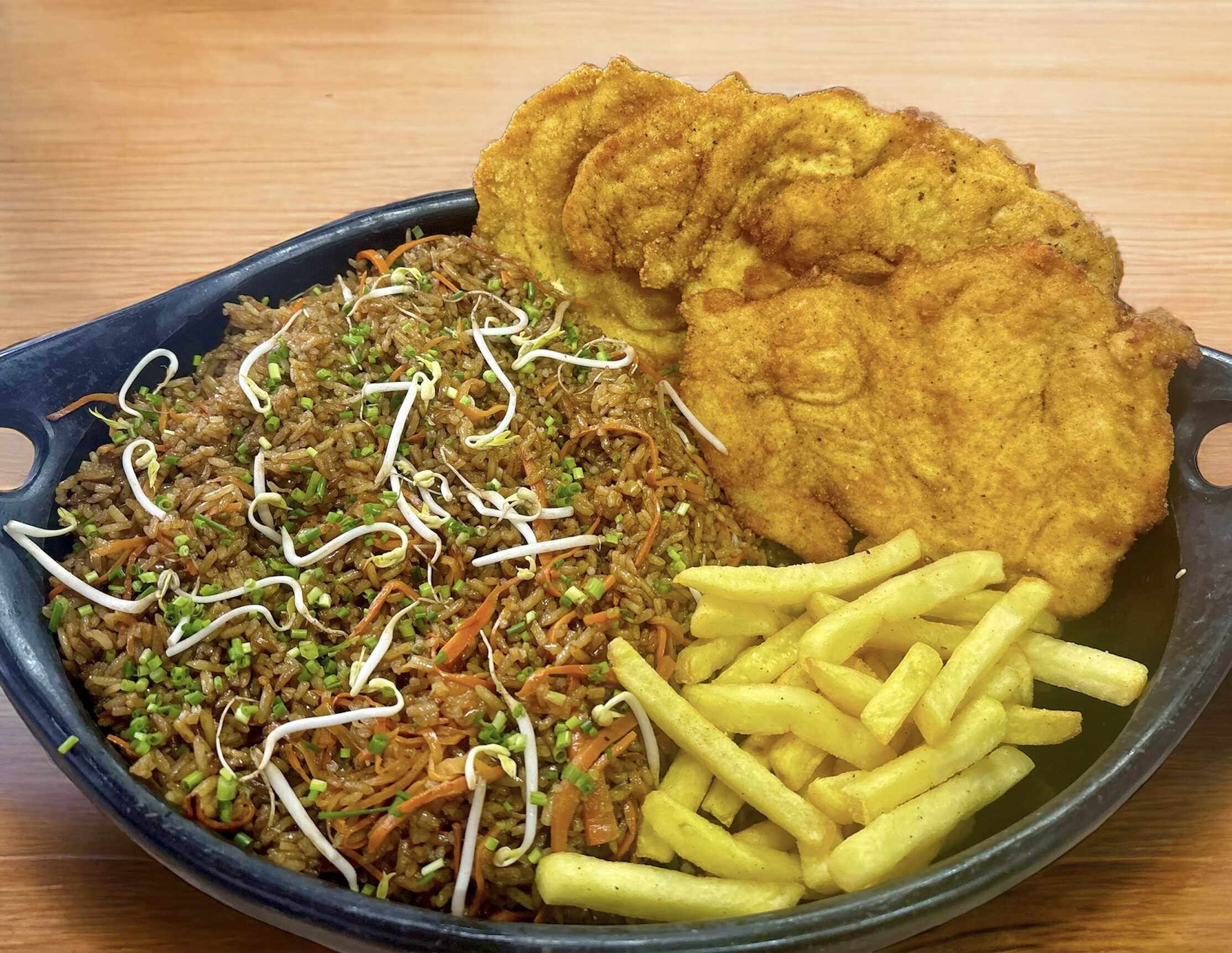 300 g De arroz (pollo, jamón, camarón, verduras salteadas al wok) + Chuleta de Pollo