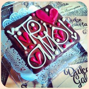 Brownie melcochudo decorado con mensaje de "Te amo" y corazones.