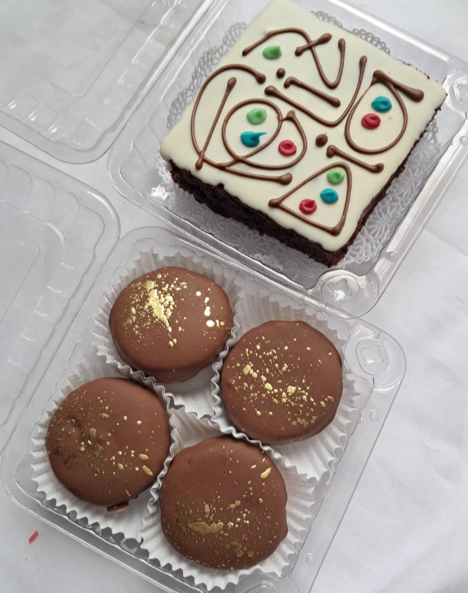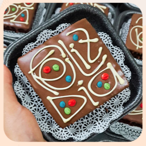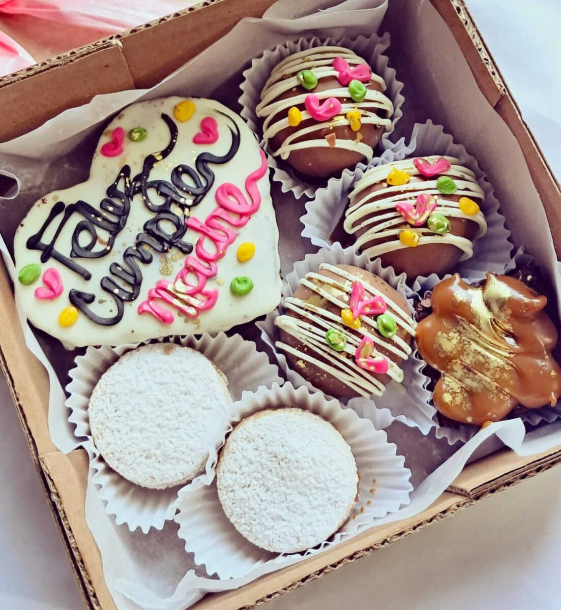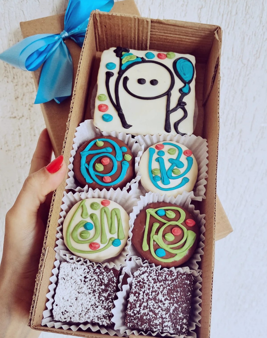 -brownie decorado con mensaje de cumpleaños: (feliz cumple, feliz día, te amo) -2 alfajores clásicos -mini brownie arequipe -3 trufas de brownie cubiertas y decoradas con chocolate