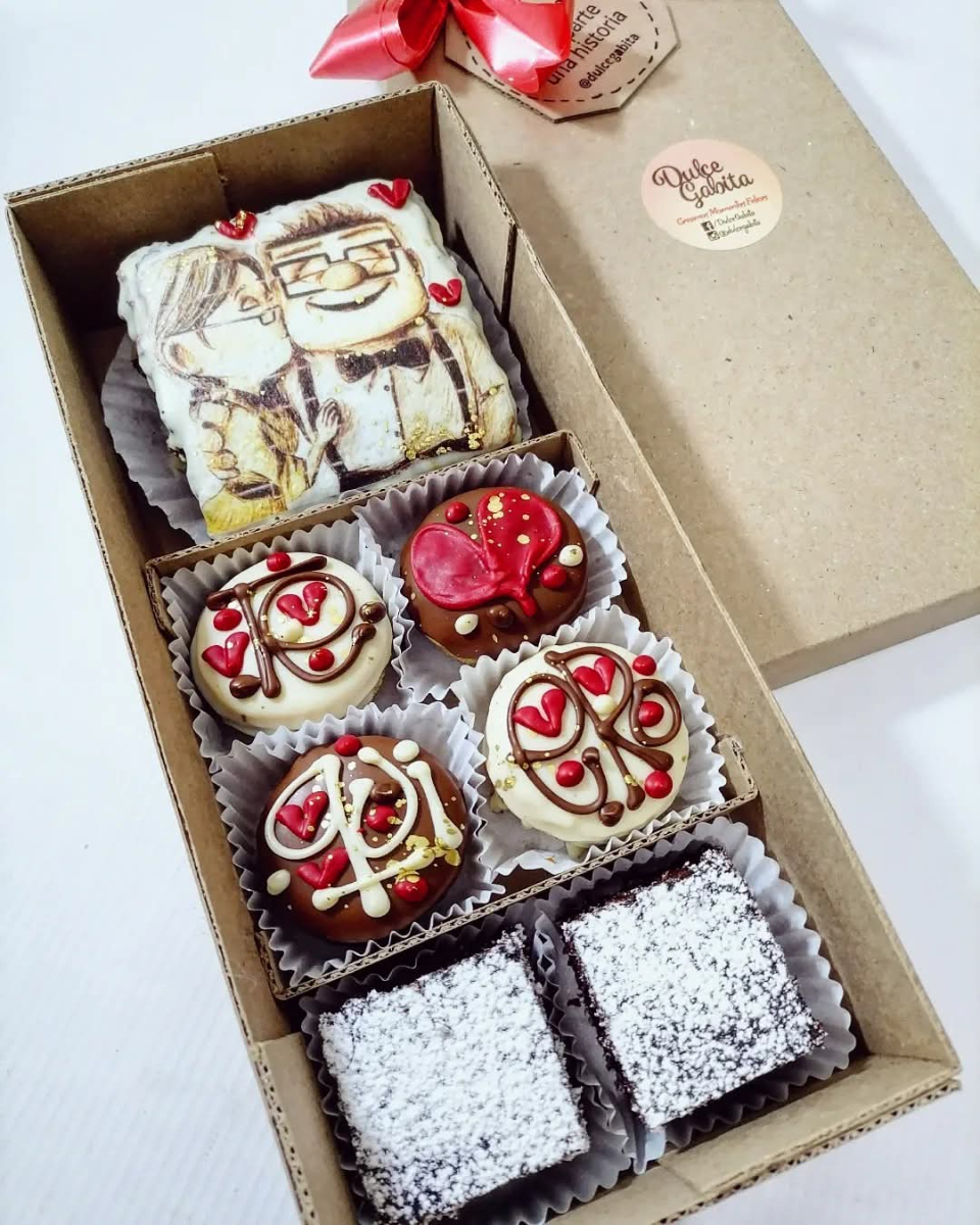 -Brownies cubierto y decorado con chocolate (figura viejitos up) -4 alfajores rellenos de arequipe, cubiertos y decorados con chocolate, mensaje: "te quiero" o "te amo" -2 mini brownies clásicos