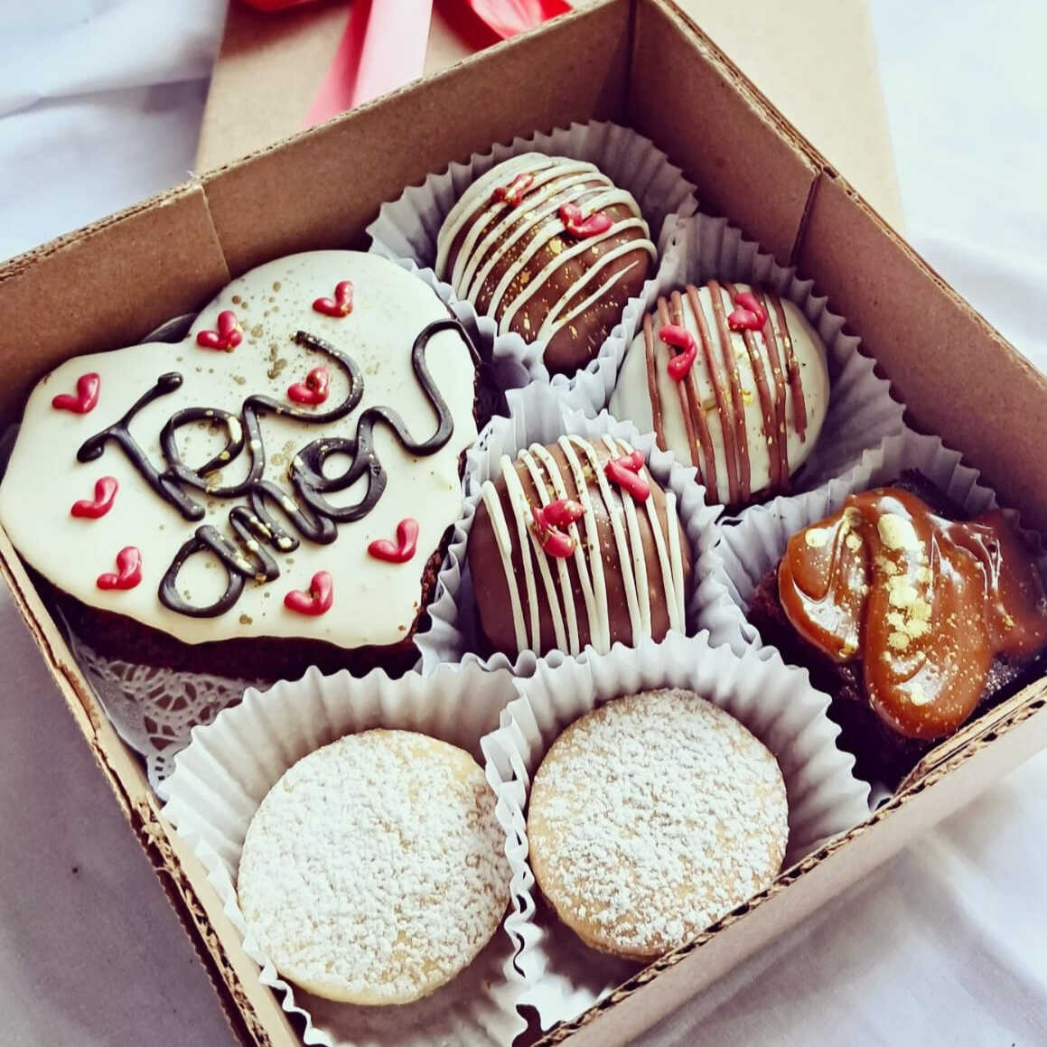 -brownie cubierto y decorado con chocolate mensaje: te amo -3 trufas de brownie cubiertas y decoradas con chocolate -2 alfajores clasicos -mini brownie de arequipe