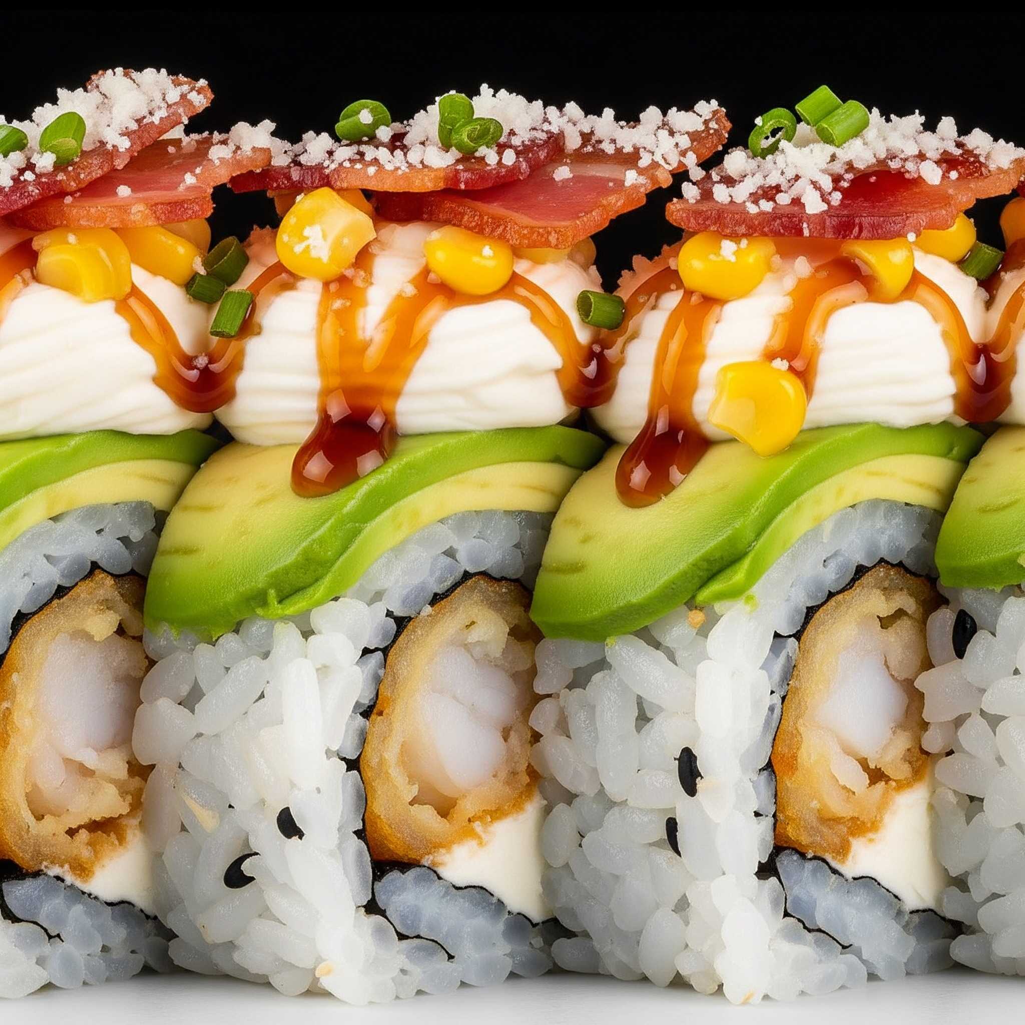 Delicioso rollo relleno de queso crema, aguacate y langostino en tempura con topping de queso crema, maíz dulce, tocineta y queso parmesano, rallado en salsa teriyaki y cebollín.
