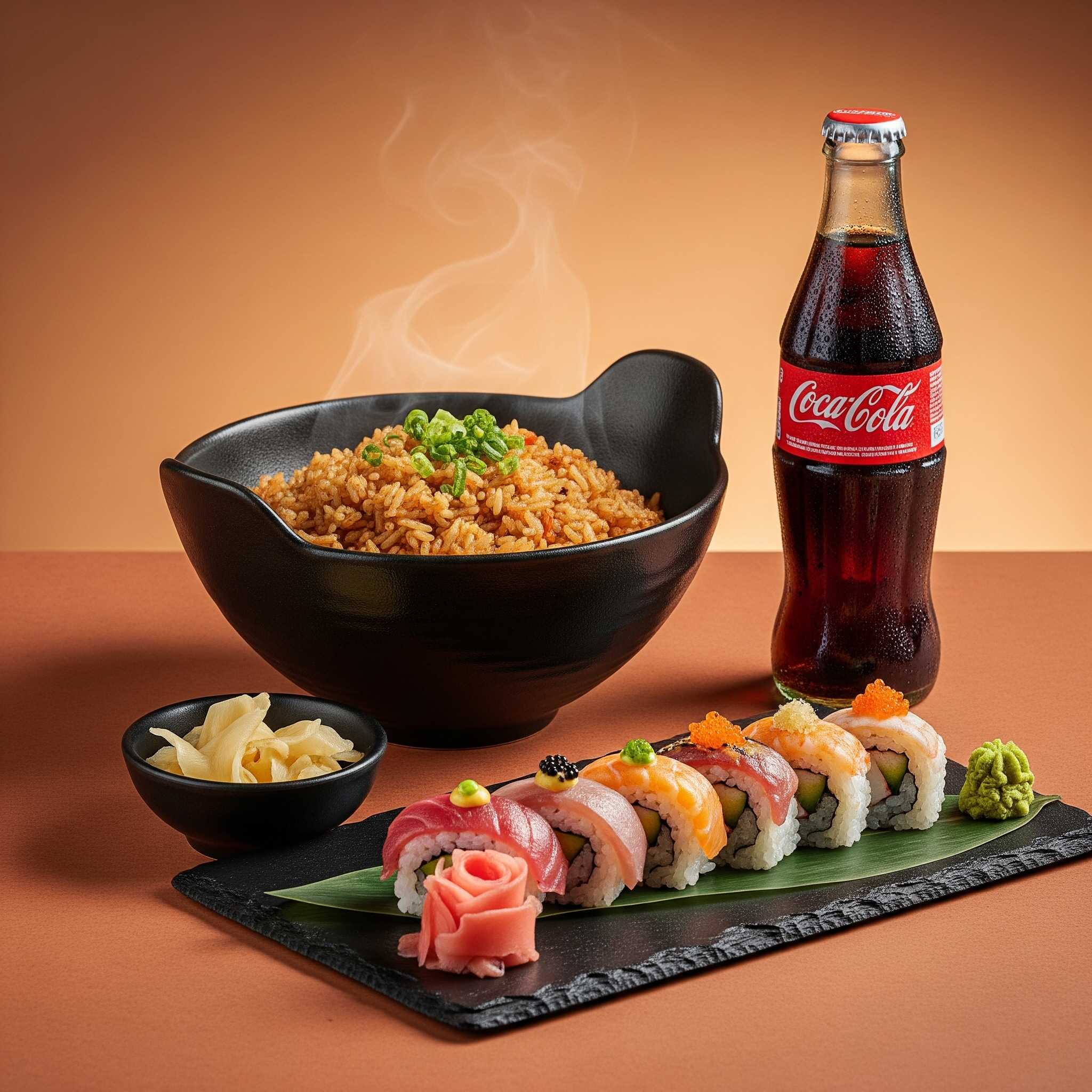 Arroz wok 350 g y 5 bocados de sushi del día más coca cola 250 ml.
