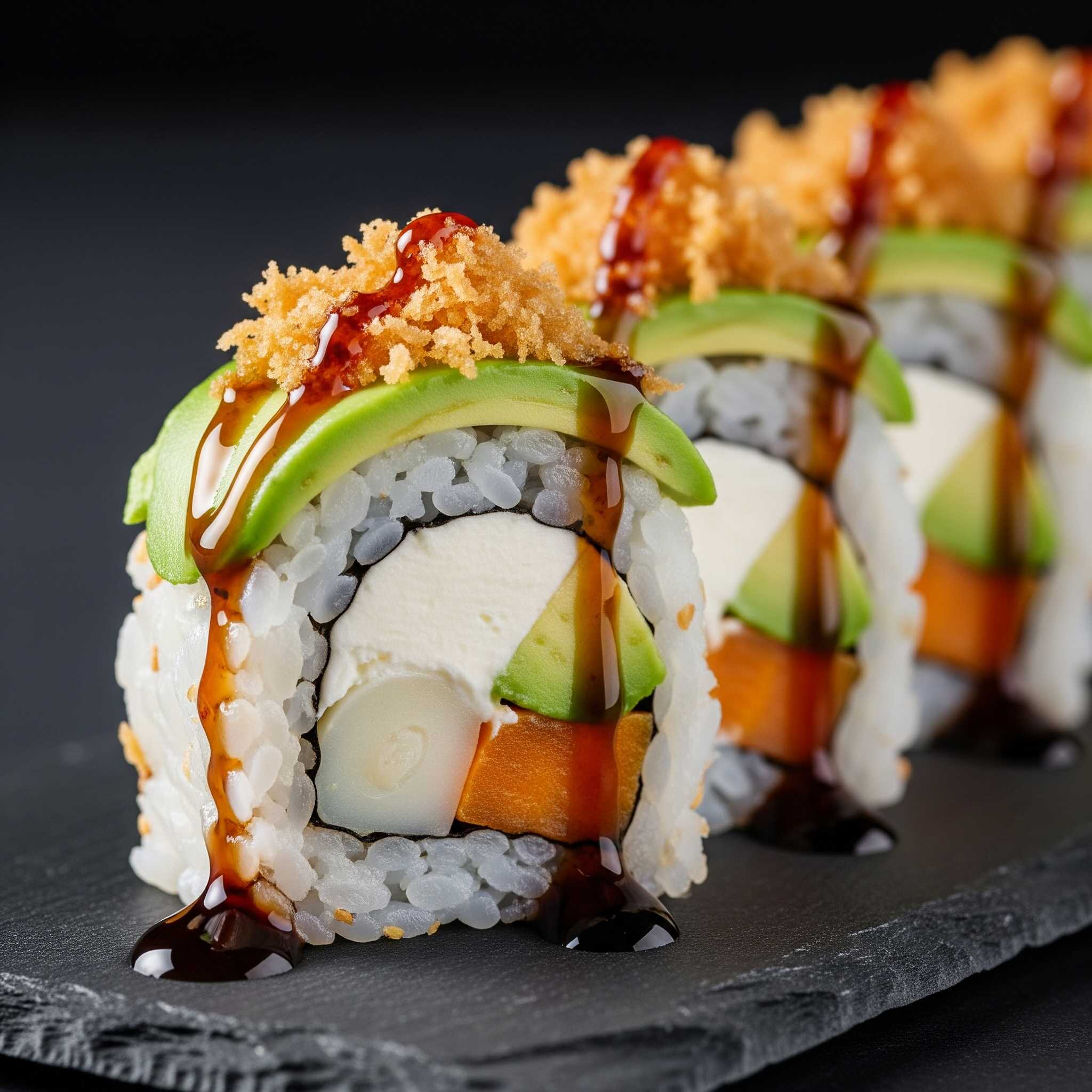 Delicioso rollo relleno de queso crema, aguacate y palmito premium. Topping, maduro dulce rallado con teriyaki.