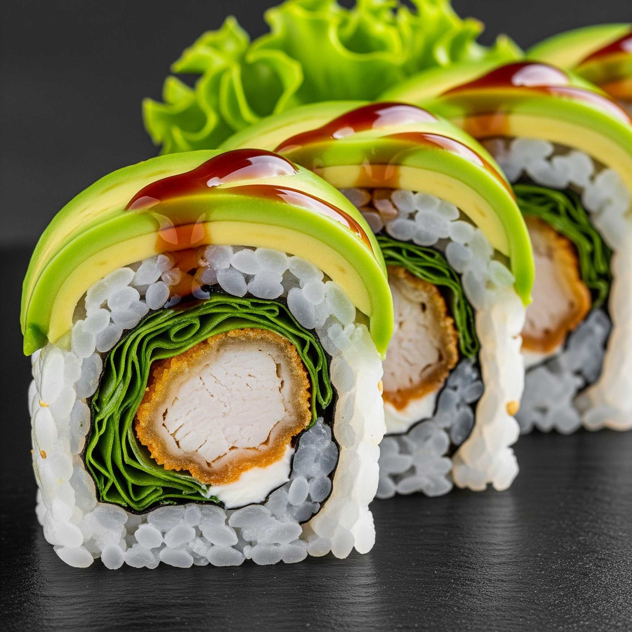 Delicioso rollo relleno de pollo apanado, queso crema, lechuga crespa. Topping, aguacate y salsa teriyaki.