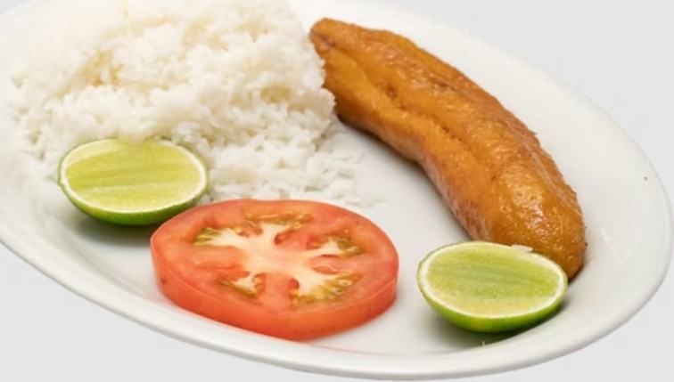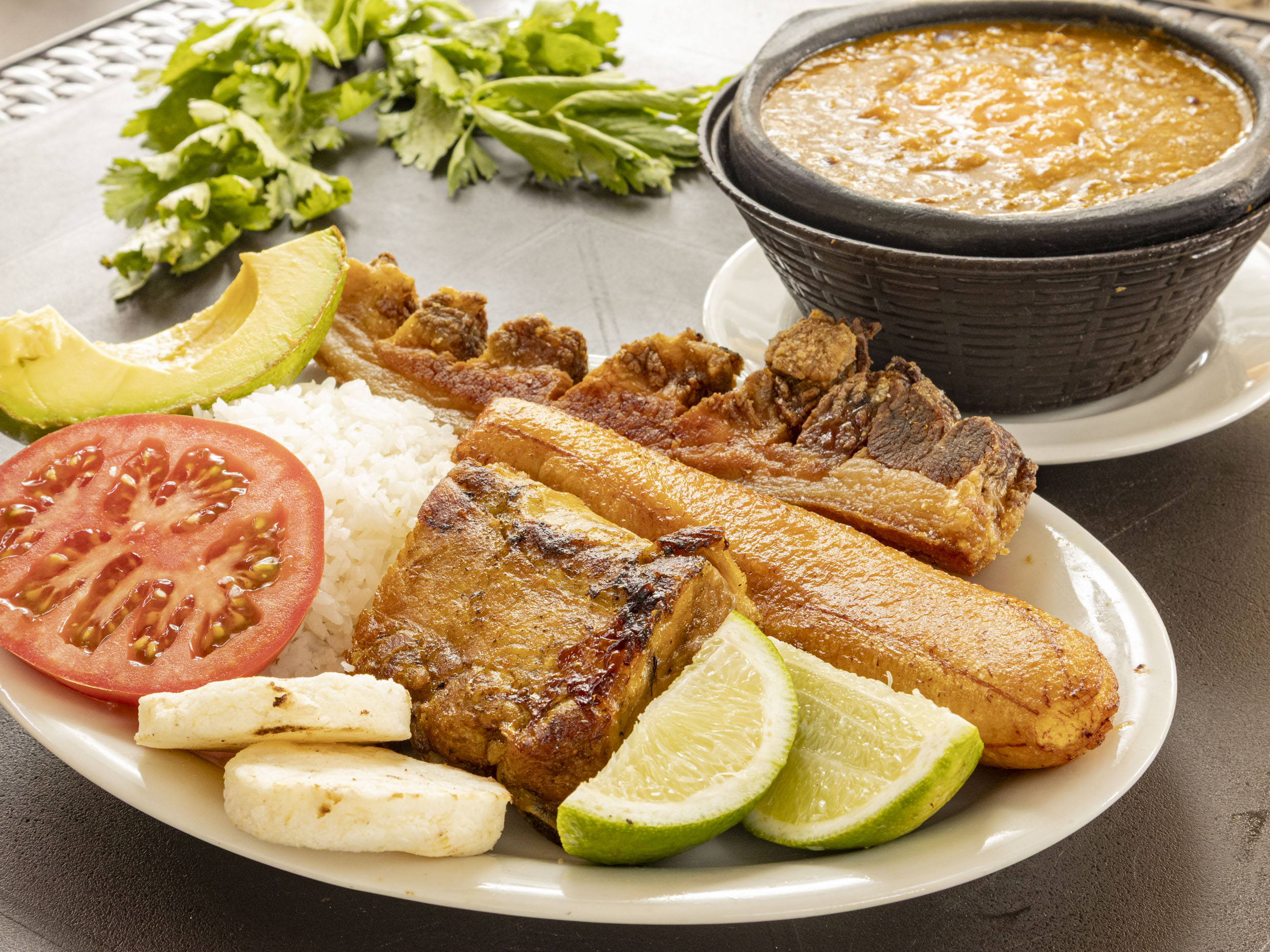 Frijoles, costilla de cerdo, chicharrón, arroz, maduro, aguacate, arepa, tomate y limón.