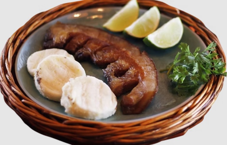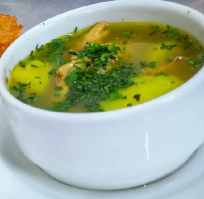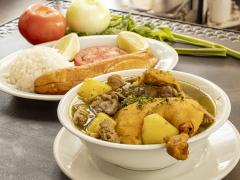 Consomé con presa con 2 acompañamientos a elección entre maduro, papa a la francesa y arroz + tomate y limón.