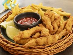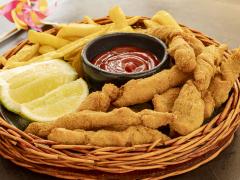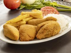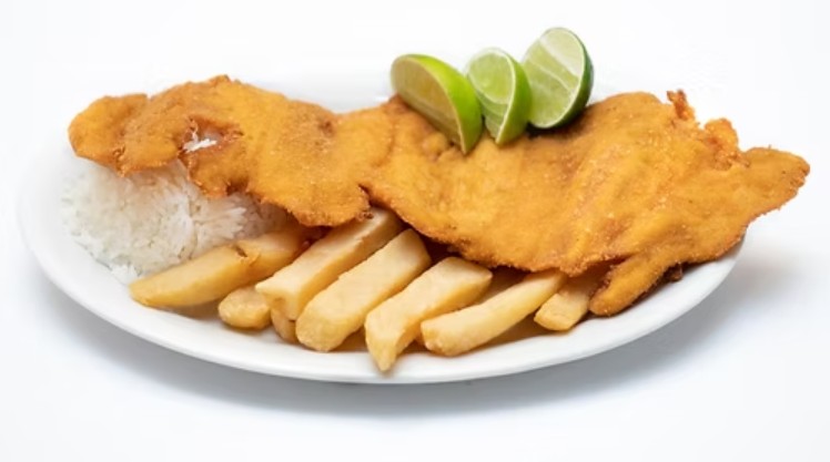 Medio pollo apanado (4 presas de pollo) con 2 acompañamientos a elección entre maduro, papa a la francesa y arroz + tomate