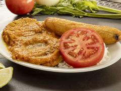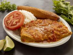 Lengua a la criolla, con 2 acompañamientos a elección entre maduro, papa a la francesa y arroz + tomate