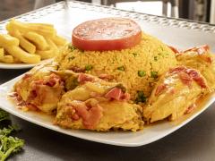 Arroz con 4 presas de pollo, acompañado con papa francesa o maduro y tomate.