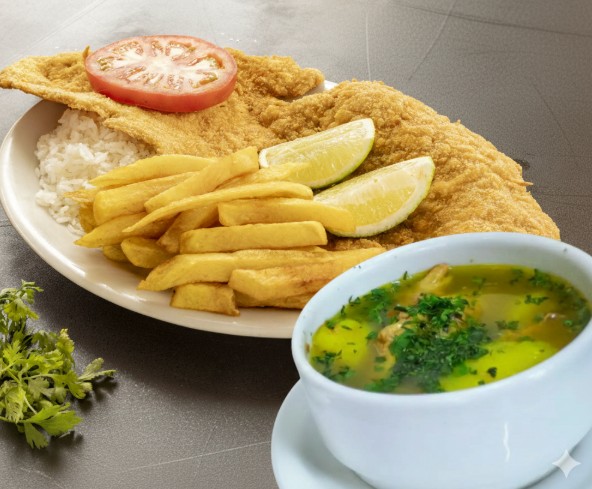 Nuestra tradicional chuleta de cerdo con 2 acompañamientos a elección entre maduro, papa a la francesa y arroz + tomate y limón, acompañada de nuestro delicioso consomé con menudencias.