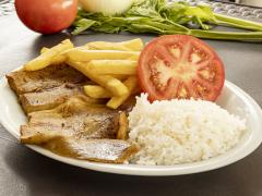 (Sugerido para 1 a 2 personas) Chuleta de cerdo con 2 acompañamientos a elección entre maduro, papa a la francesa y arroz + tomate y limón.