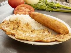 Sobrebarriga a la plancha,con 2 acompañamientos a elección entre maduro, papa a la francesa y arroz + salsa criolla + tomate y limón.