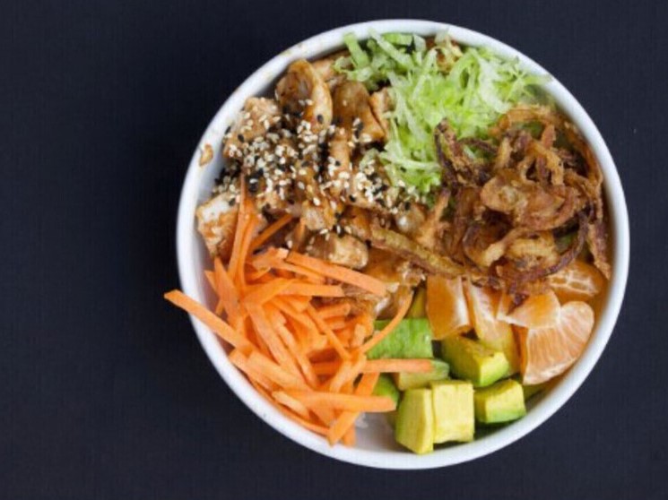 Cuadritos de pollo a base de mandarina y miel, cebolla crocante, cascos de mandarina, lechuga, zanahoria y aguacate.