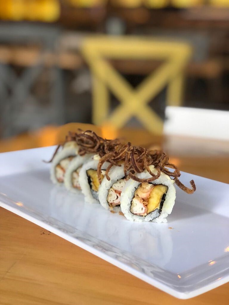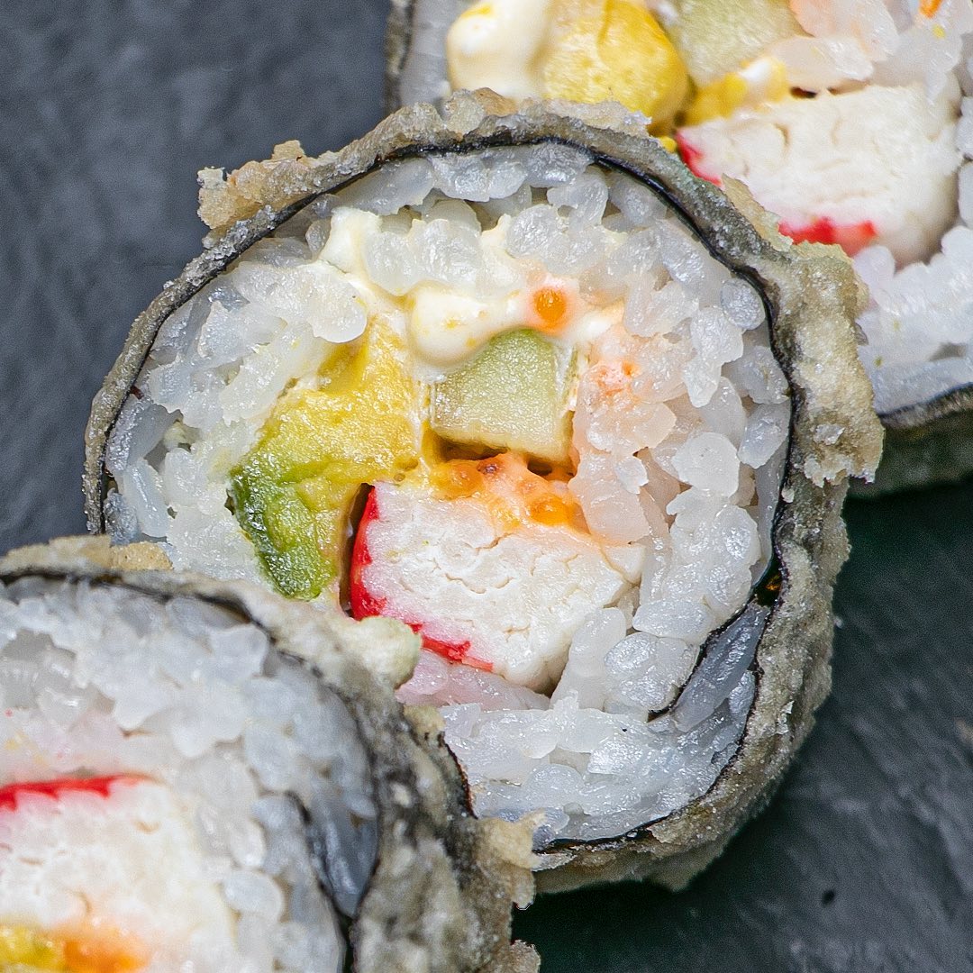 Salmón, atún y palmitos tempurados, aguacate, queso crema, ajonjolí.