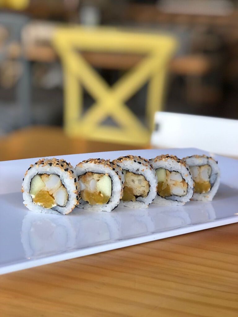 Calamar tempura, queso crema, pepino, piña calada y topping de mix de ajonjolí.