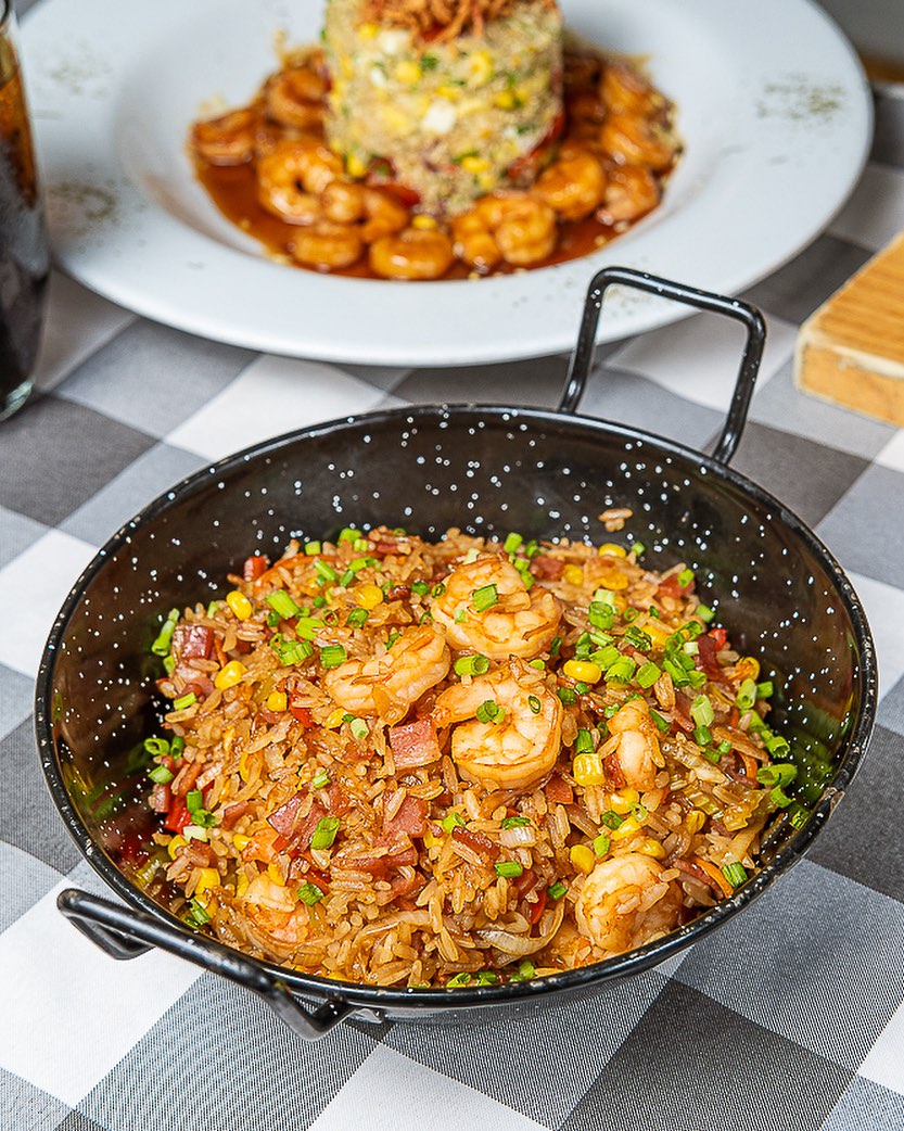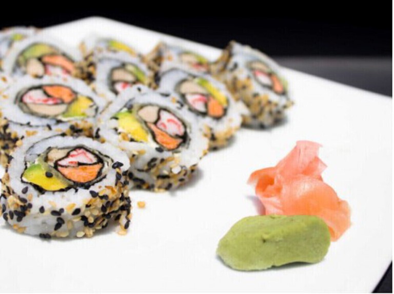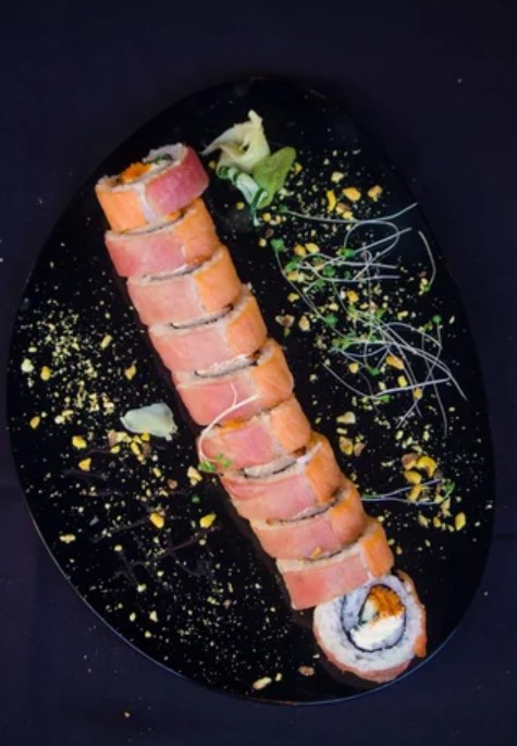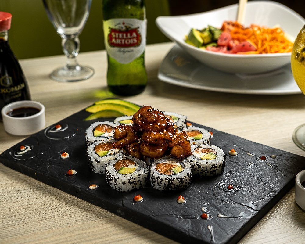 Un volcán de camarones salteados en salsa teriyaki, sobre un rollo con salmón, palmitos, queso crema y aguacate, con topping de mix de ajonjolí.