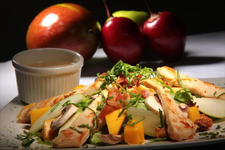 Lechuga, pollo, queso mozzarella, nueces caramelizadas, champiñones, mango y manzana, con nuestra vinagreta a base de yogurt.