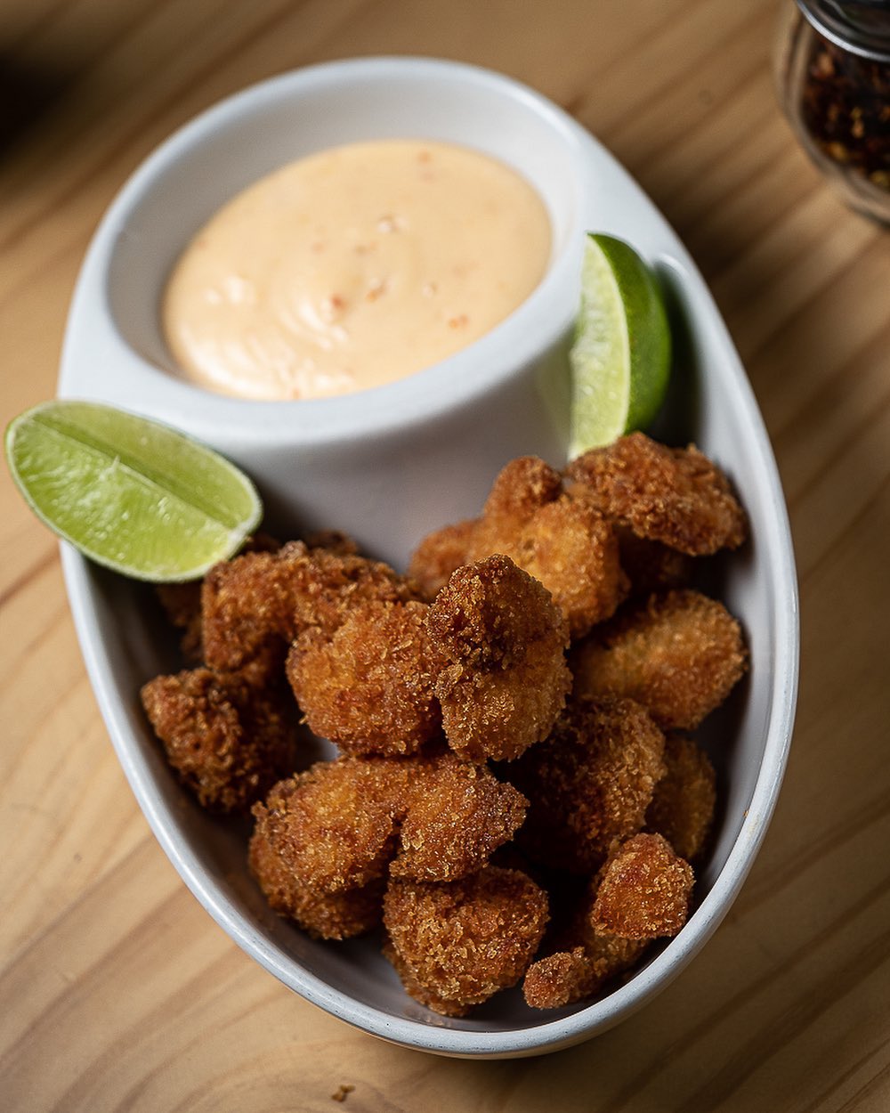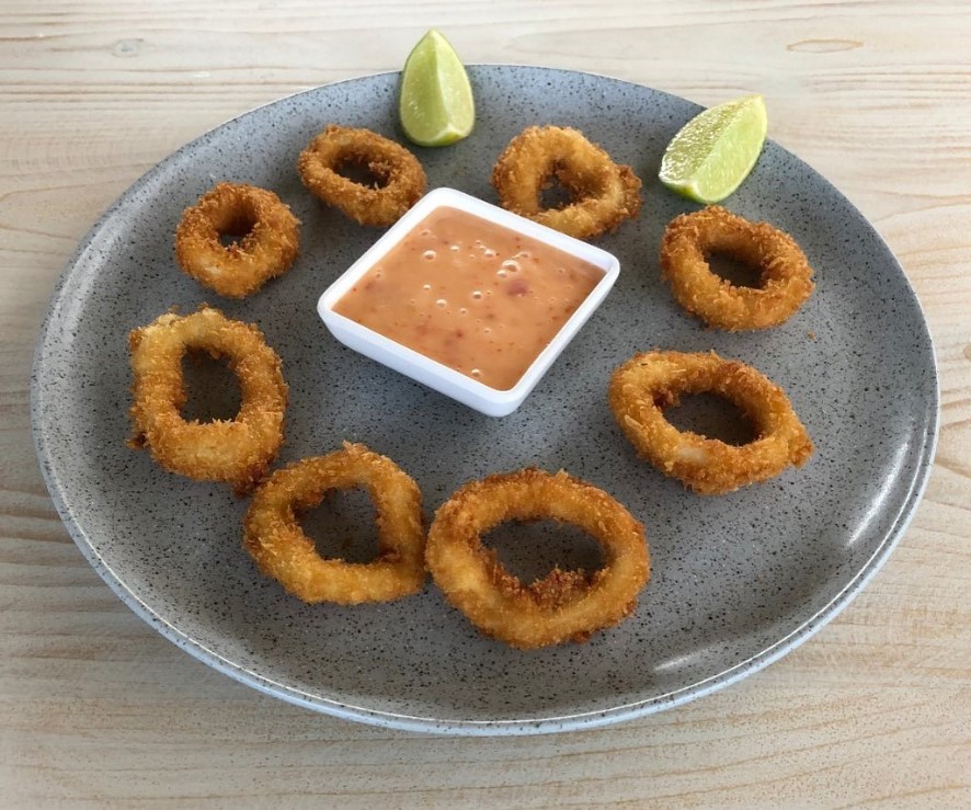 Anillos de calamar apanados en panko con salsa de chille dulce.